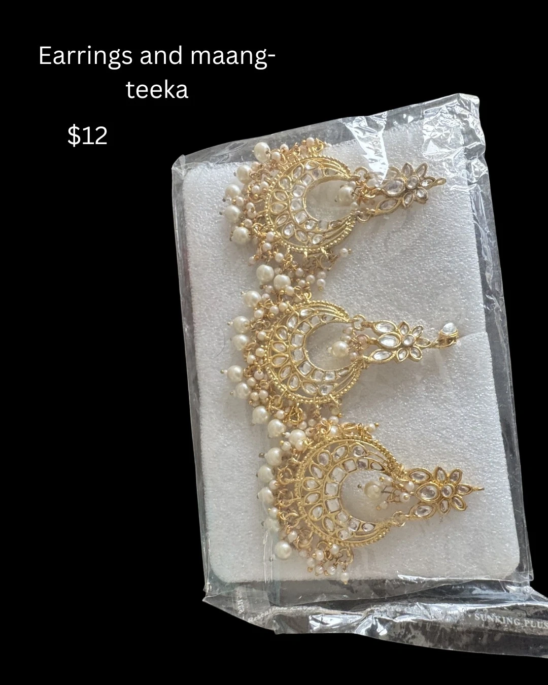 Gold-toned earrings and maang-teeka set with pearl and stone embellishments. Intricate crescent moon design with floral accents. Perfect for special occasions!