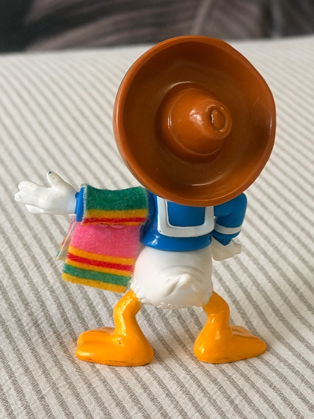 This is a Donald Duck toy figure dressed in a sombrero and a colorful serape. The figure is made of plastic. It's a fun collectible piece!