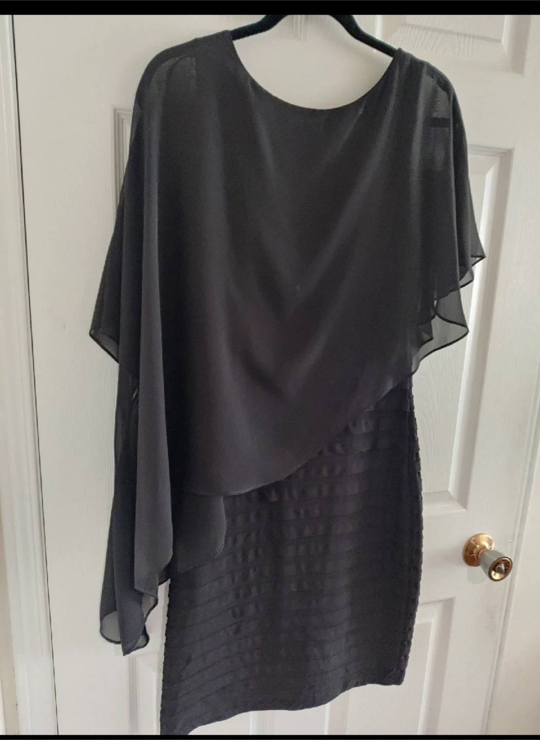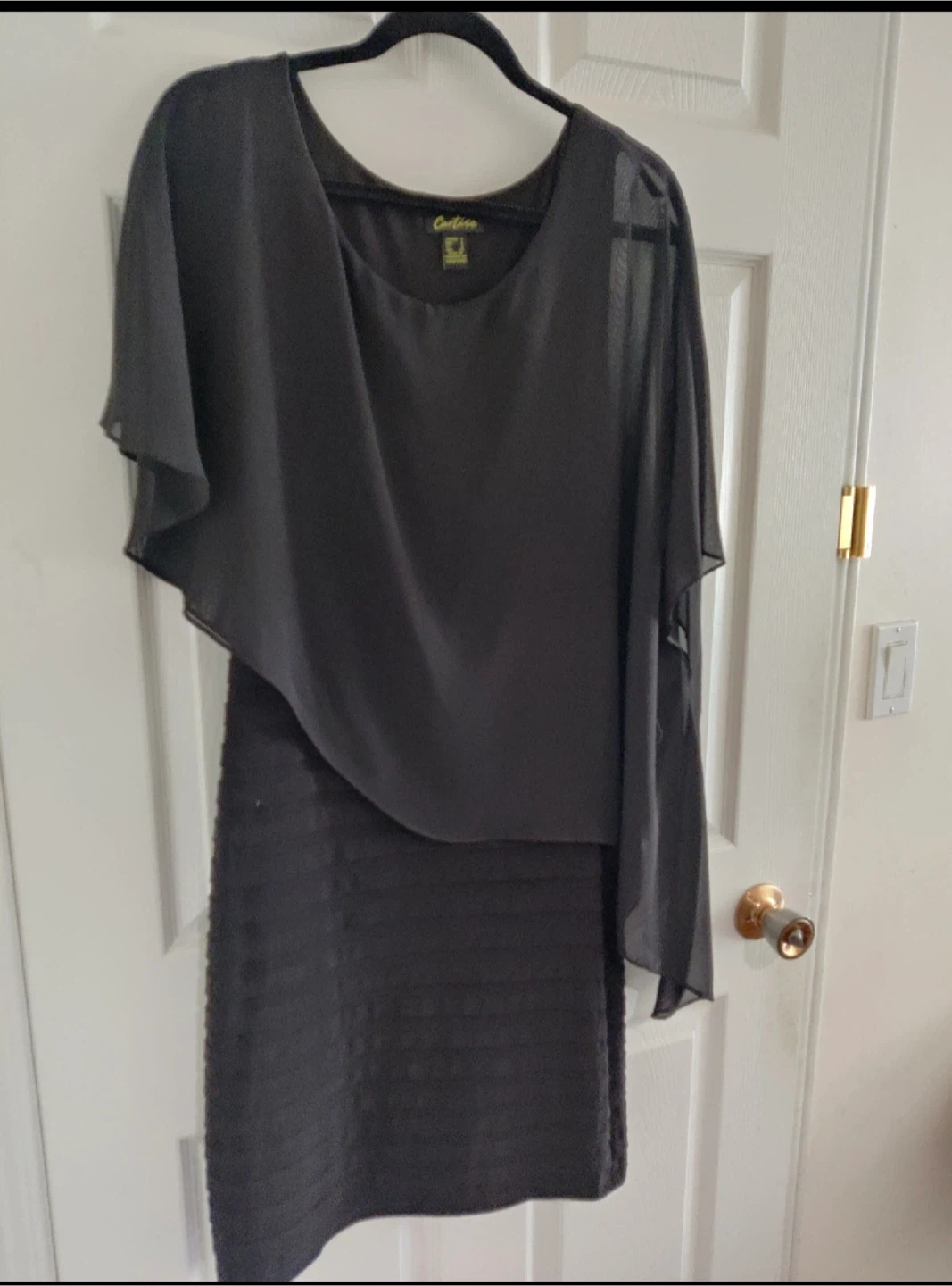 Elegant black dress by Cartise. It features a chiffon overlay for a sophisticated look. Perfect for a special occasion. Size 8.