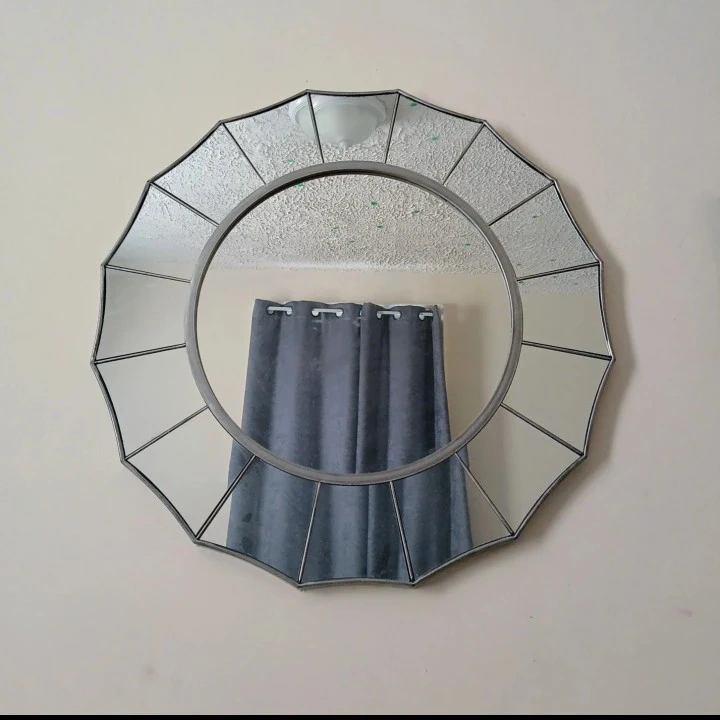 Add a touch of elegance to your home with this decorative sunburst mirror. It features a circular glass mirror surrounded by a unique, segmented frame.