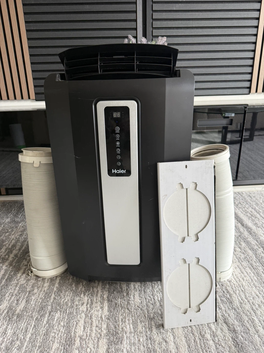 Haier portable air conditioner in black. It's a functional unit that can help cool your space. Includes exhaust hose and window adapter pieces.