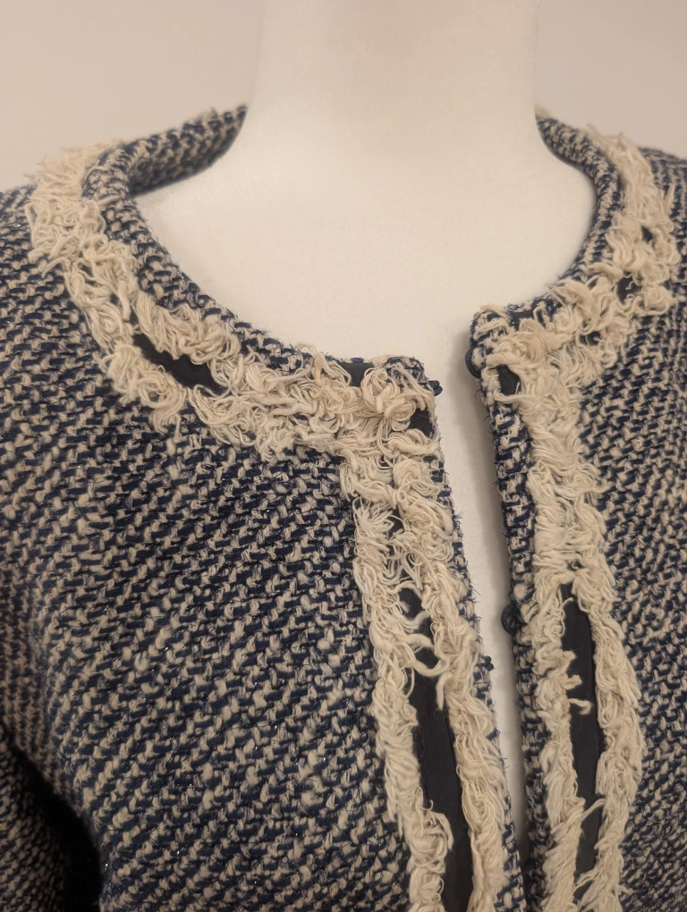 This is a lovely Tory Burch tweed jacket in a size 8. It features a navy and cream tweed pattern with decorative fringe detailing around the edges. Crop fit is tres cute and creates a unique flaire when added over a tank whether you are going for a work meeting or dinner date in jeans. Perfect for adding a touch of sophistication to any outfit!