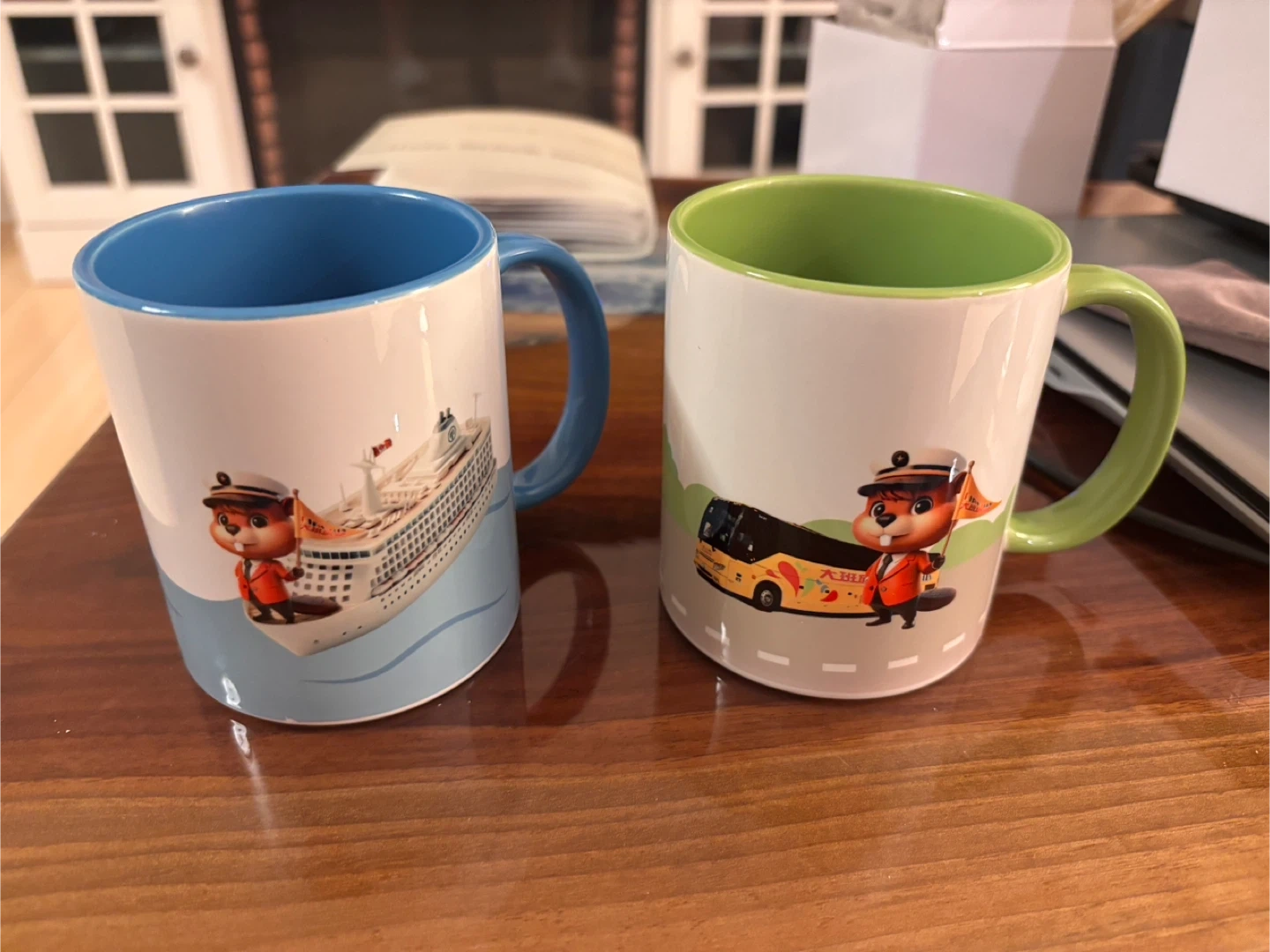 Set of two ceramic mugs featuring a cute beaver mascot on a cruise ship and a tour bus. One mug has a blue interior and handle, the other has a green interior and handle. They're perfect for enjoying your morning coffee or tea while reminiscing about a trip! Ceramic material.