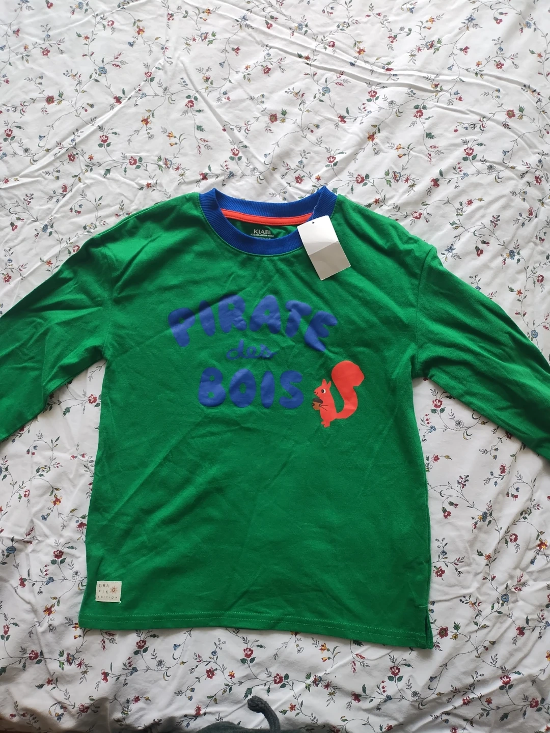 Two Kiabi long-sleeved t-shirts. One features navy and red horizontal stripes. The other is green with a blue "Frais des bois" graphic and a squirrel illustration. Both are size 10A.kids size.
