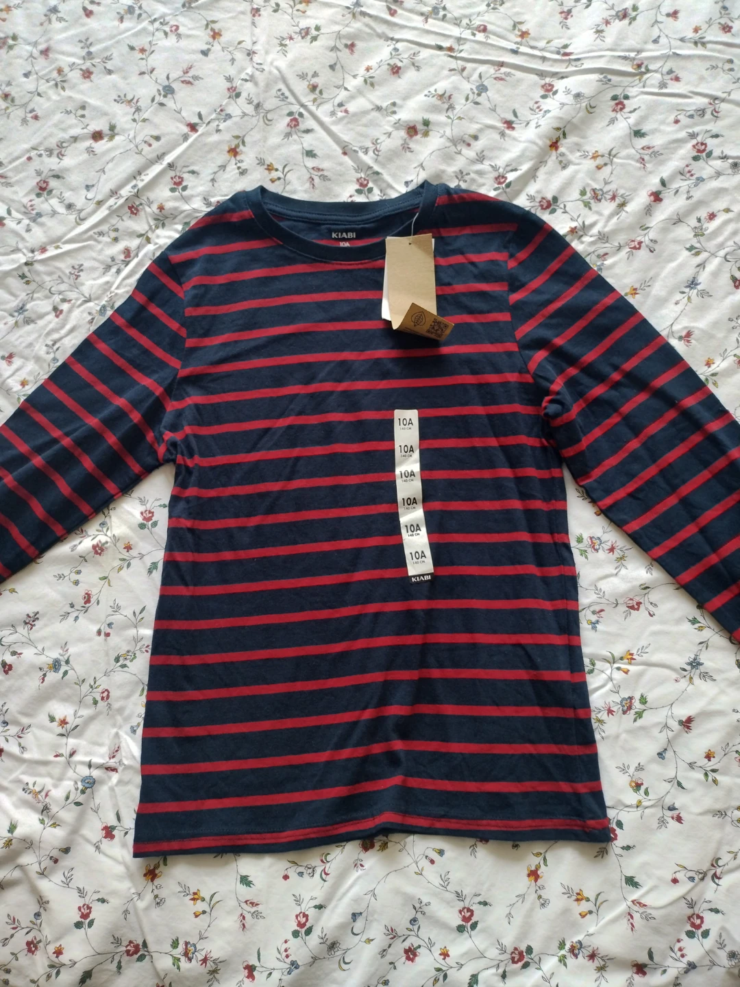 Two Kiabi long-sleeved t-shirts. One features navy and red horizontal stripes. The other is green with a blue "Frais des bois" graphic and a squirrel illustration. Both are size 10A.kids size.