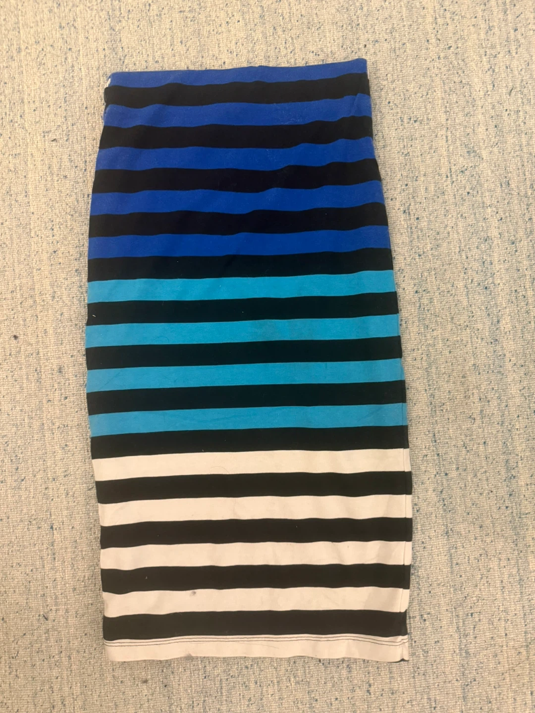 This pencil skirt features a colorful striped pattern with shades of blue, black, and white. It's a comfortable and versatile piece for your wardrobe. The material is a stretchy fabric.