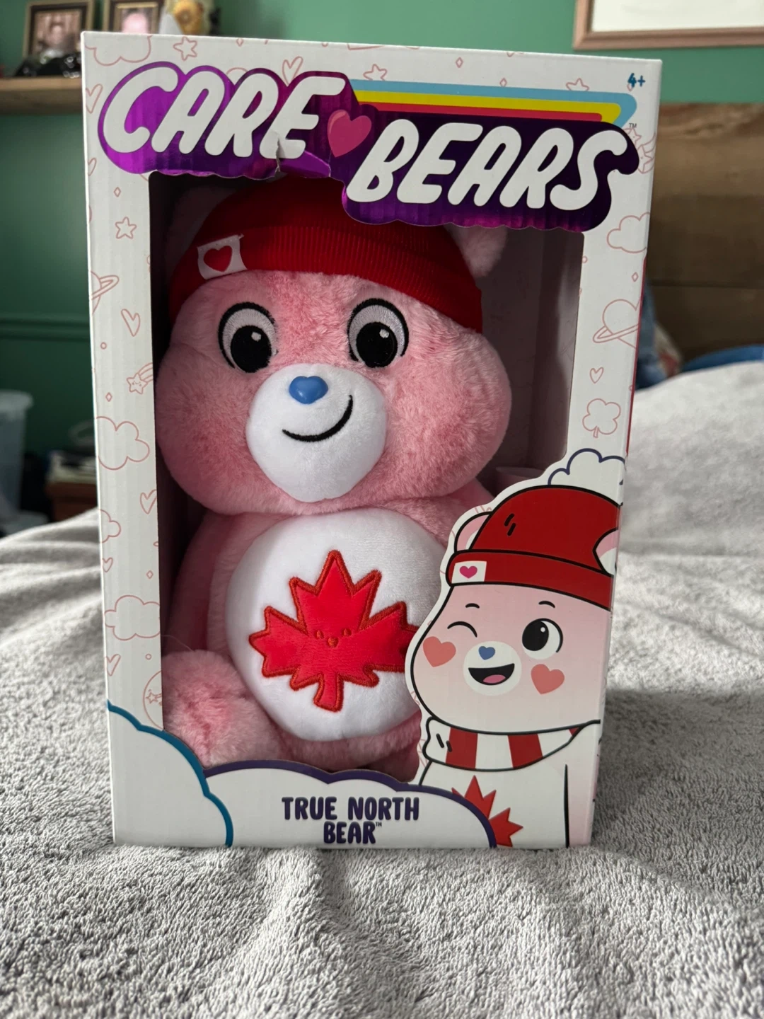 This is a pink Care Bears plush toy named True North Bear. It's wearing a red toque with a white pompom and a Canadian maple leaf emblem on its chest. It comes in its original box.