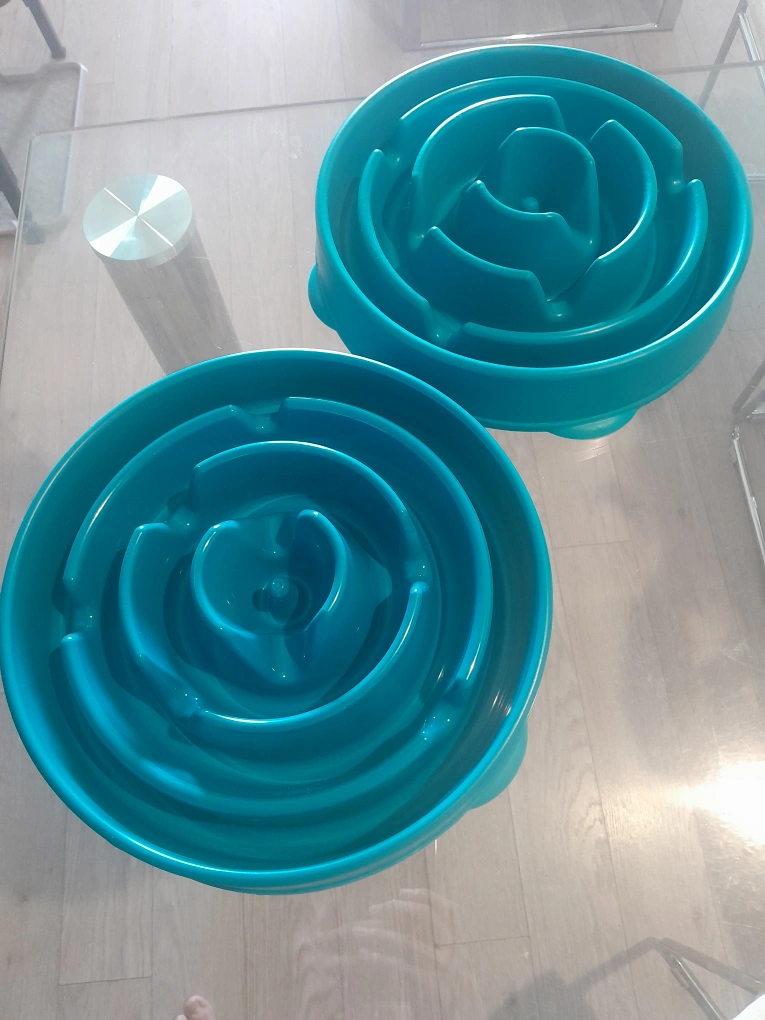 Selling a set of two teal-coloured slow feeder dog bowls. These bowls are designed to help your furry friend eat at a slower pace, which can aid in digestion and prevent bloating. They're in great condition and ready for a new home!