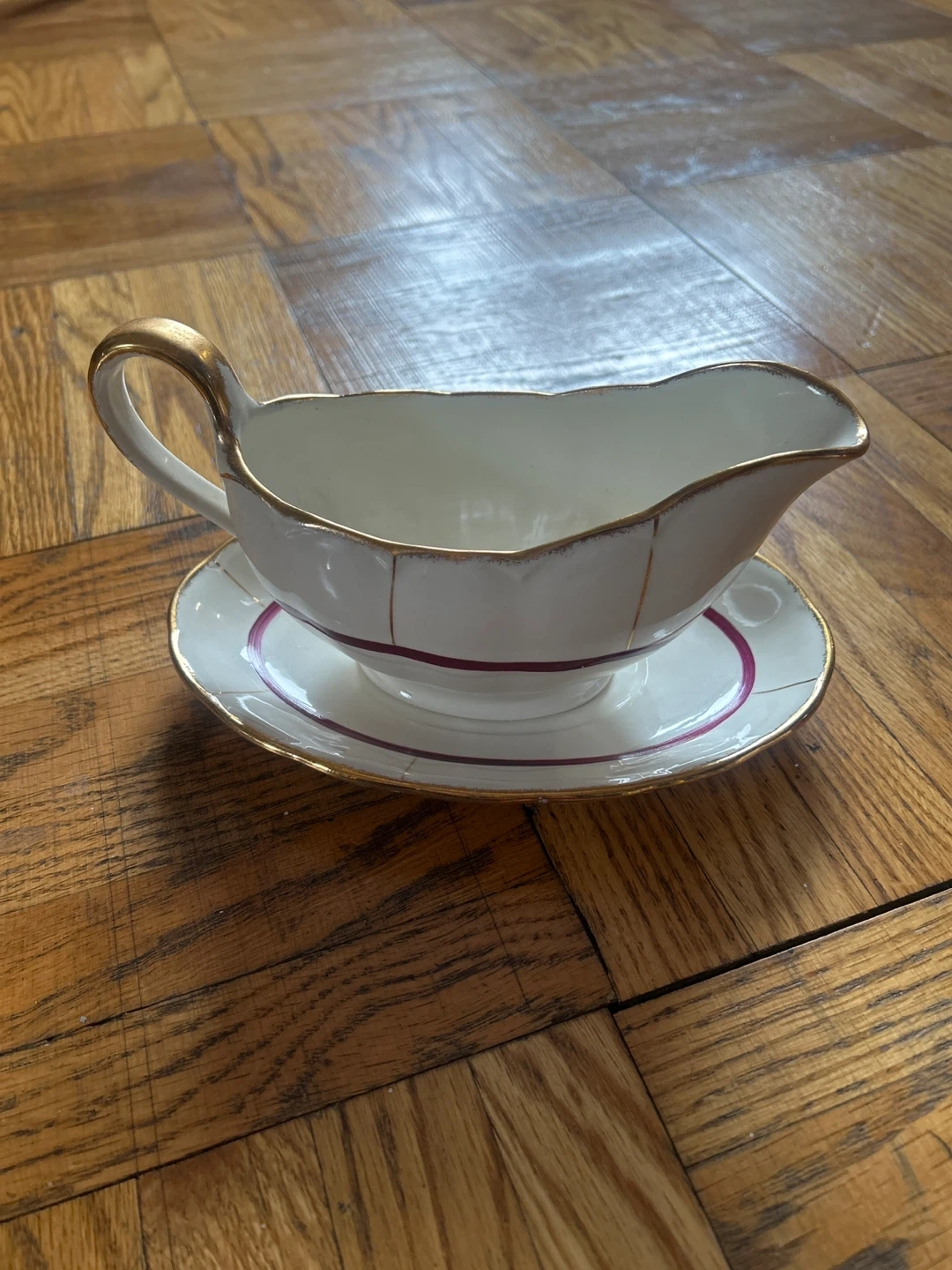 Elegant vintage white gravy boat and saucer set. Features gold trim and a delicate purple band accent. Perfect for serving gravies and sauces at your next dinner party!