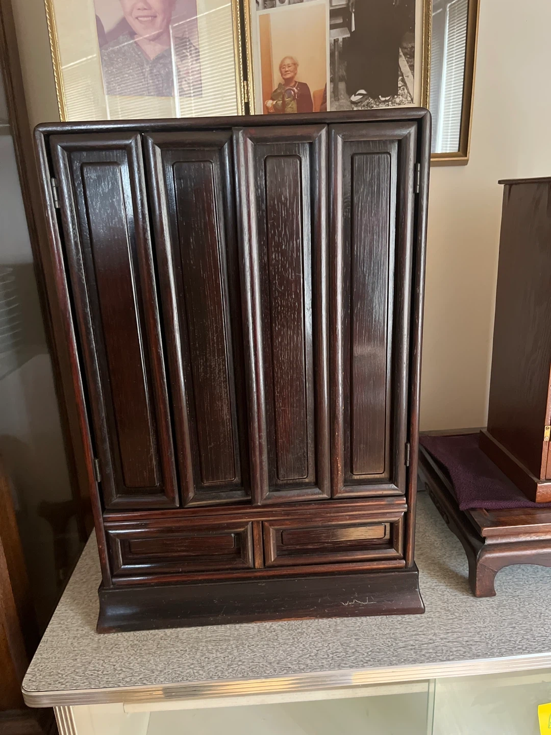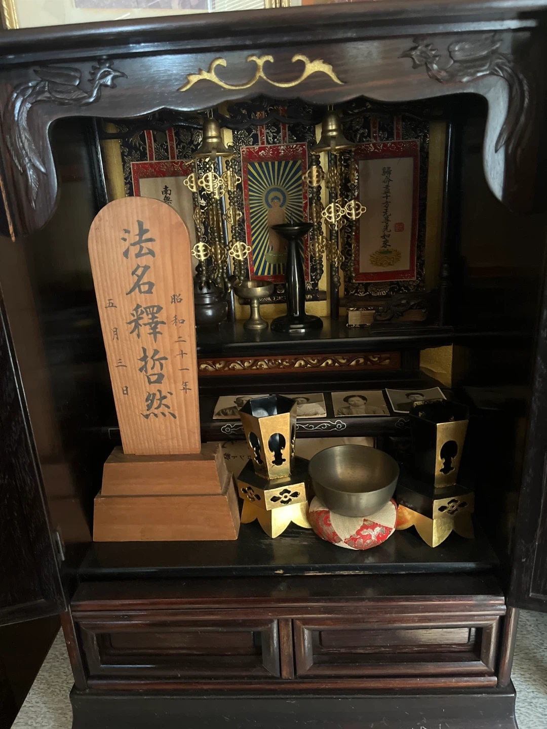 This is a traditional Buddhist altar cabinet, often called a butsudan. It's crafted from dark wood and features ornate details. Inside, it holds several items, including what appears to be a prayer tablet and a singing bowl. This piece would be a central part of a home shrine.