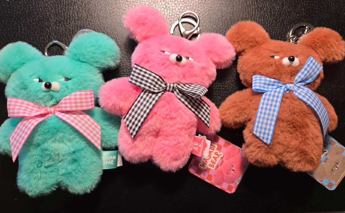Cute plush bear keychain charms in teal, pink, and brown. Each bear has a ribbon bow. Soft and fuzzy material.