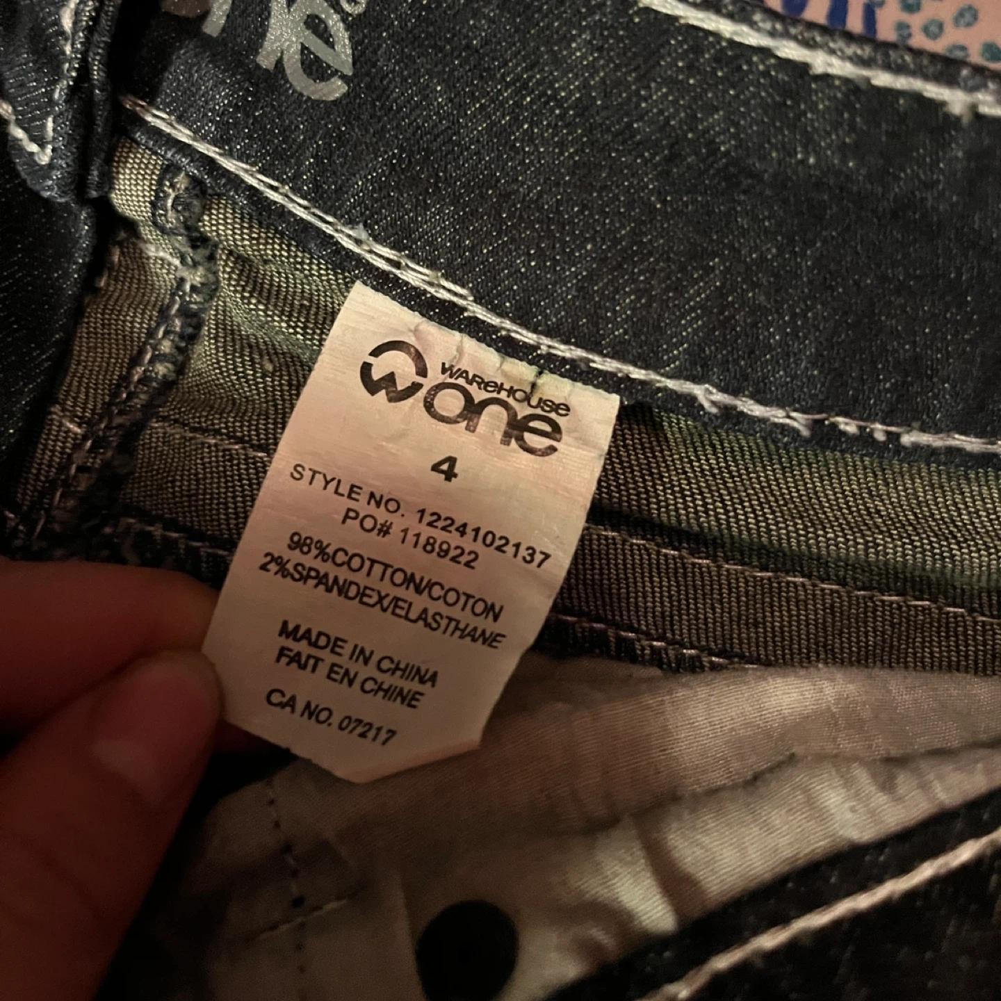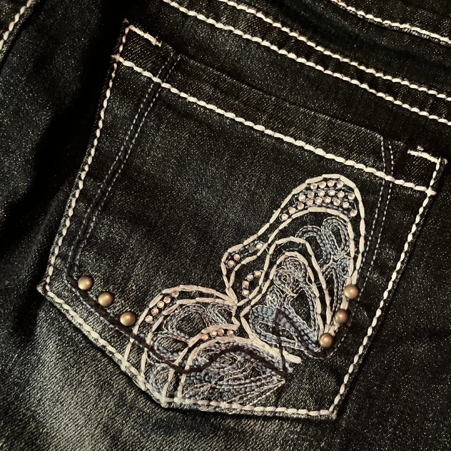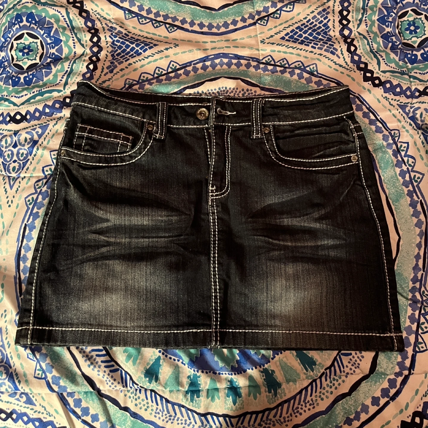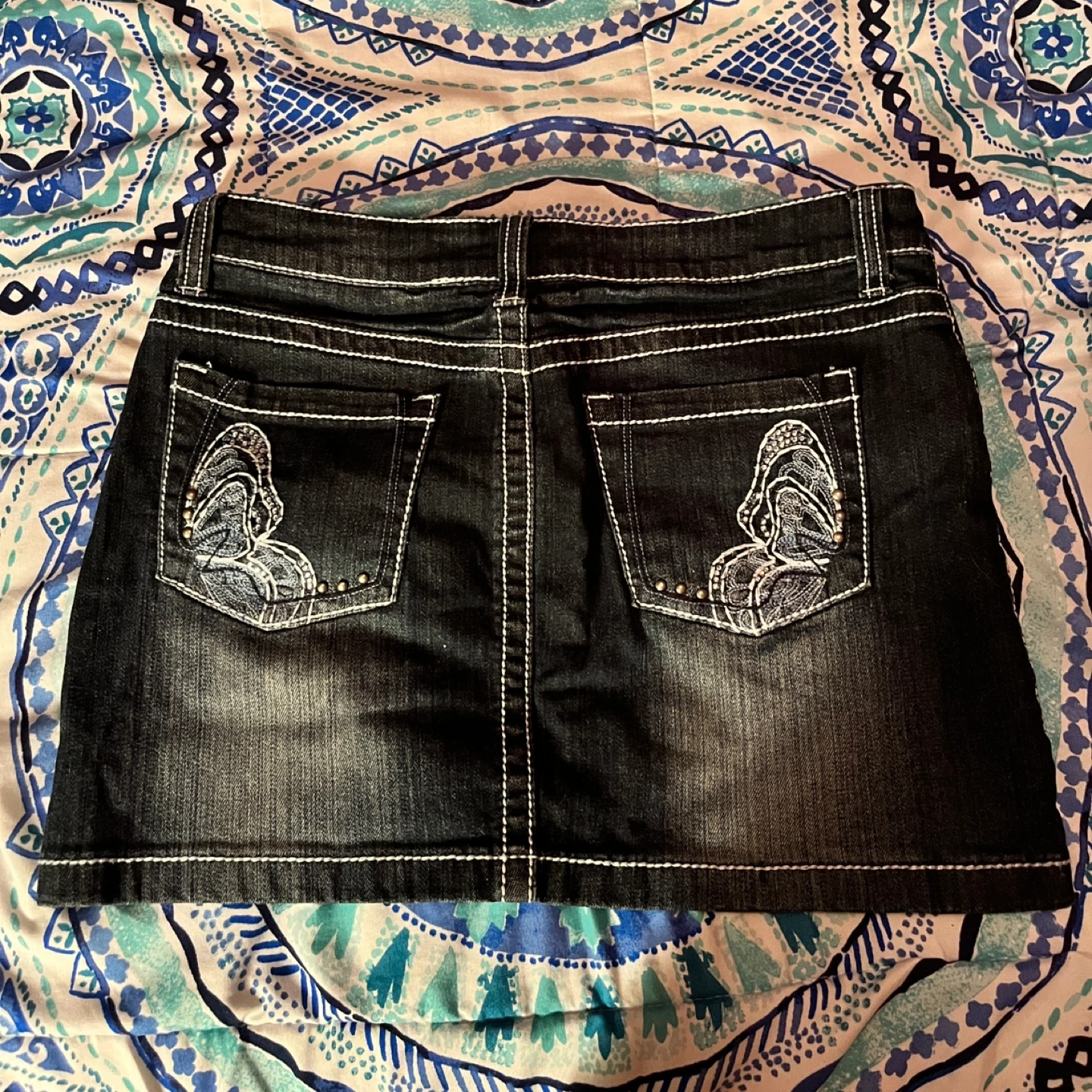 Warehouse One dark blue denim skirt with white stitching and embroidered butterfly details on the back pockets. It's made of 98% cotton and 2% spandex for a comfortable fit. Size is 4.