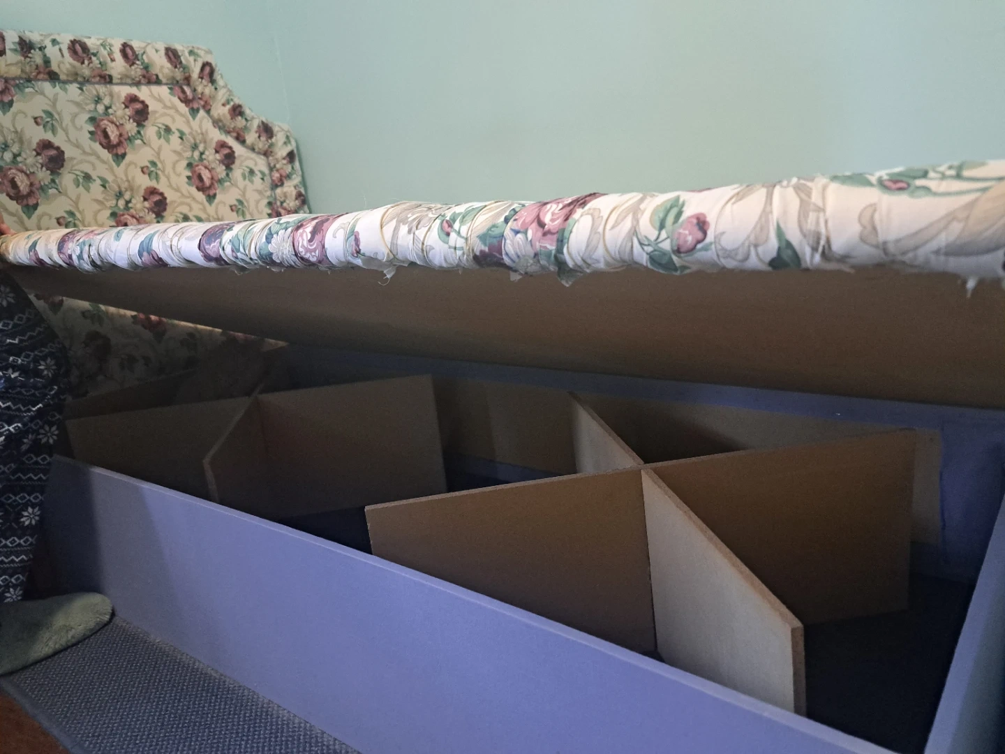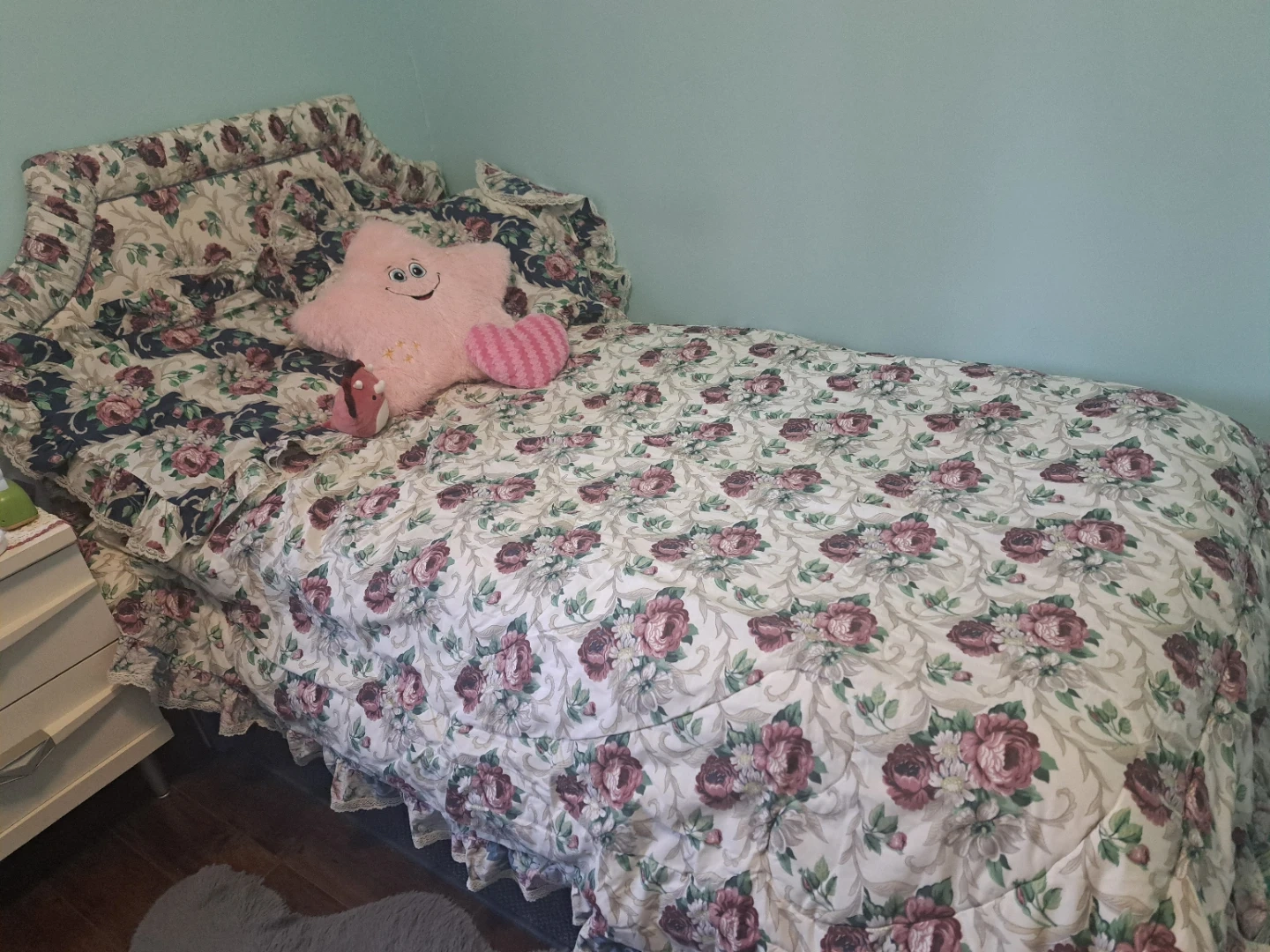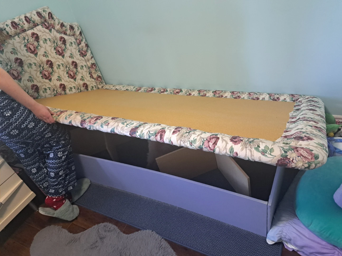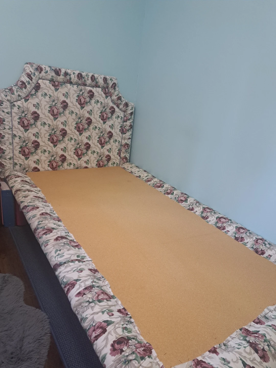 Twin bed frame for sale (mattress not included). No boxspring needed, platform bed, very sturdy. All homemade. Comes with reversible comforter and pillow shams. Great for a little girl or tween!