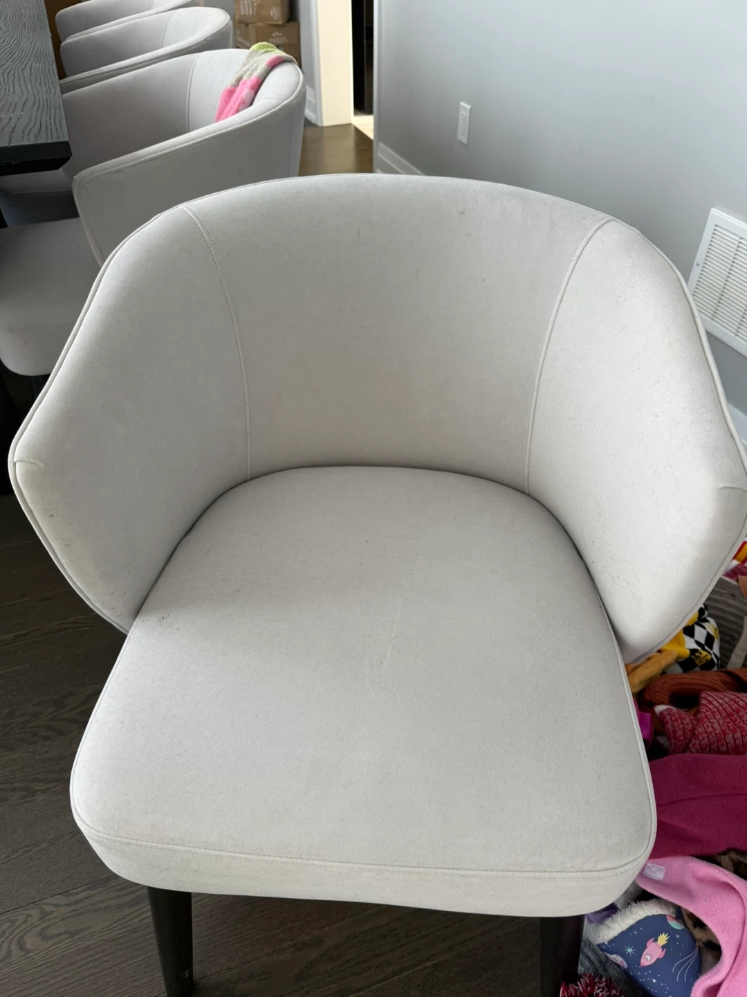 Six comfortable dining chairs with a light grey upholstered finish. These chairs offer a modern, curved design that complements a variety of dining tables. They're perfect for seating family and guests during meals.