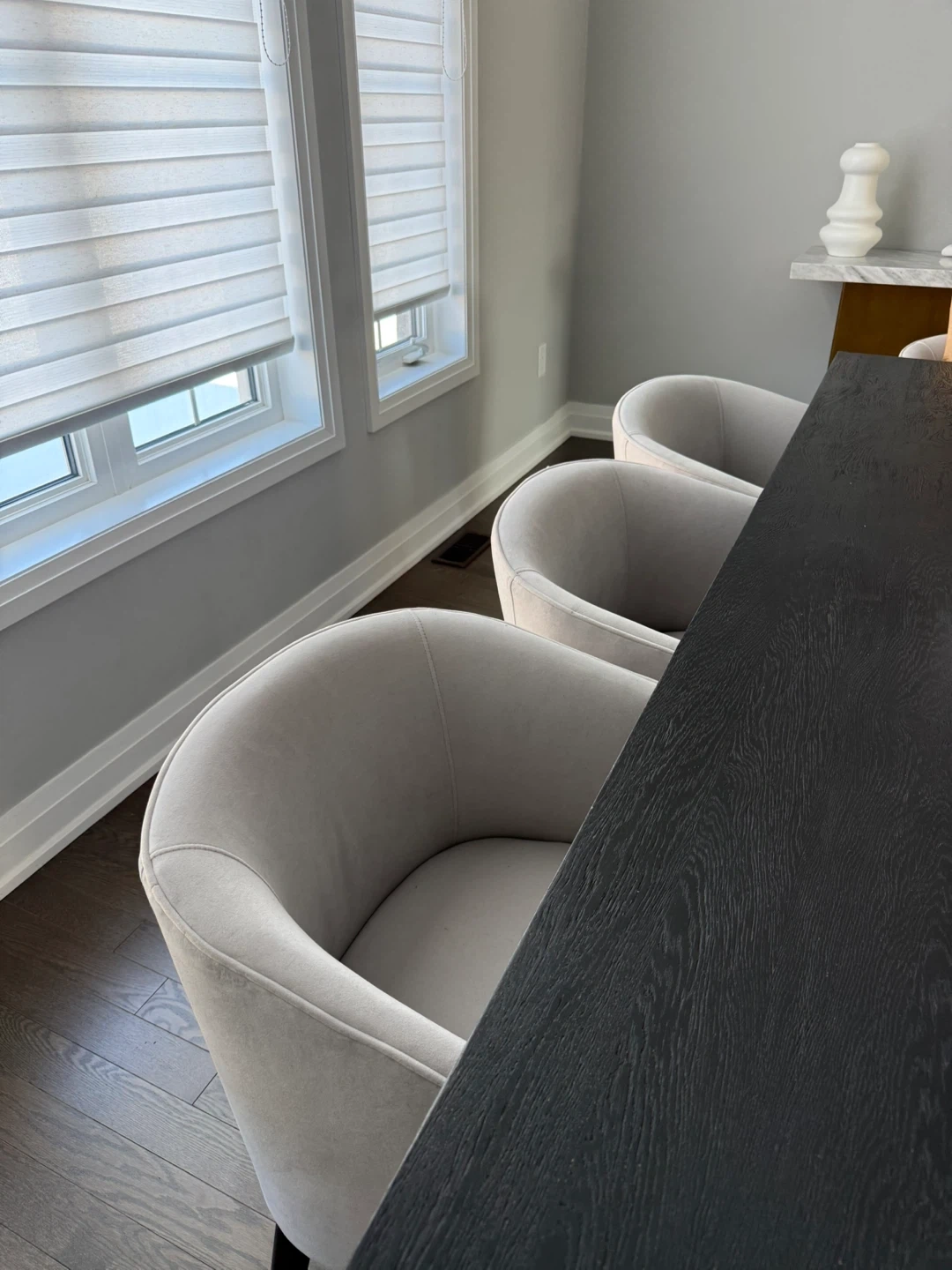 Set of 8 light grey upholstered dining chairs