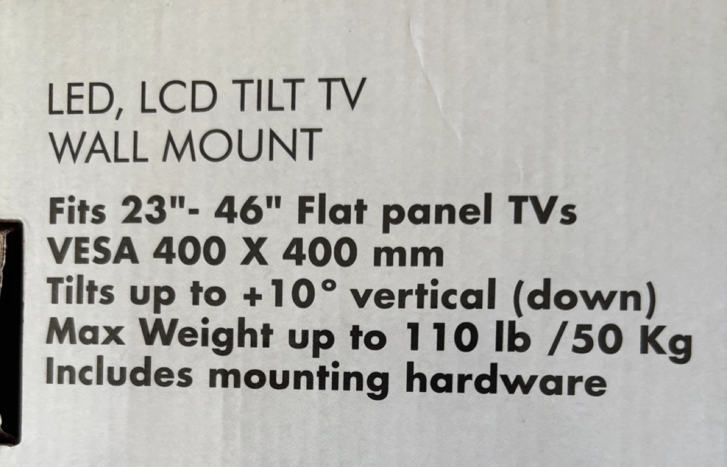 Tilting TV wall mount. Fits 23"-46" flat panel TVs. VESA 400 x 400 mm. Tilts up to +10° vertical (down). Max weight 110 lb / 50 kg. Includes mounting hardware. Ultra slim/low profile.