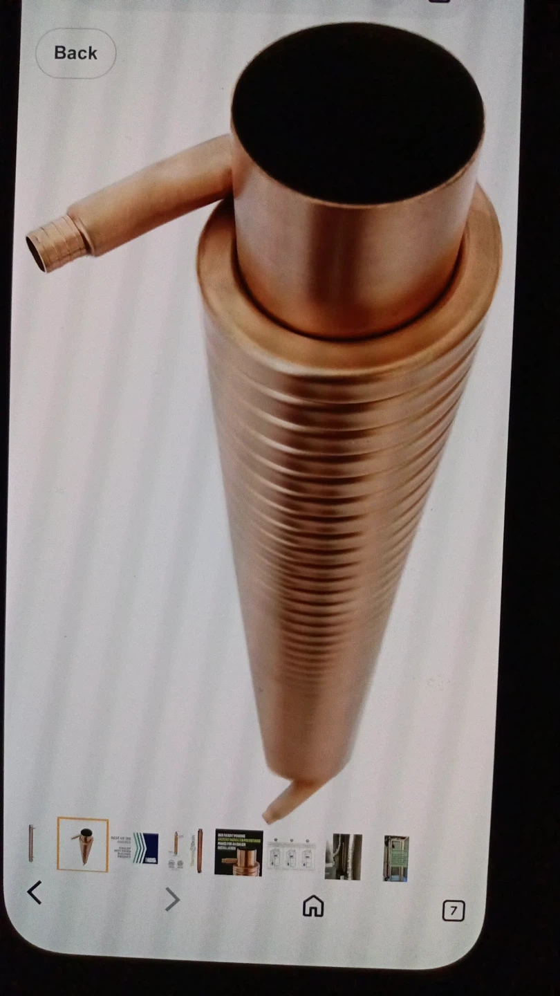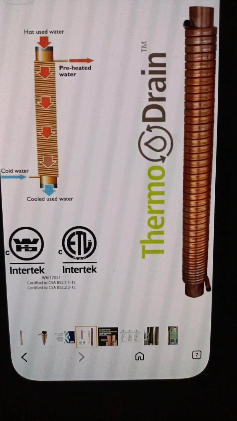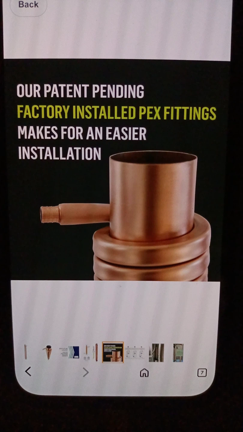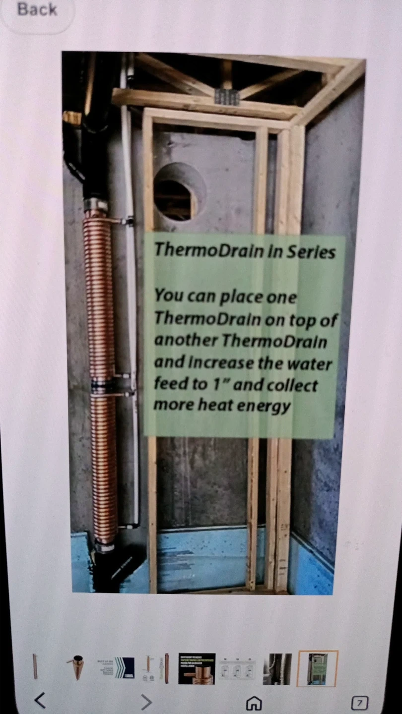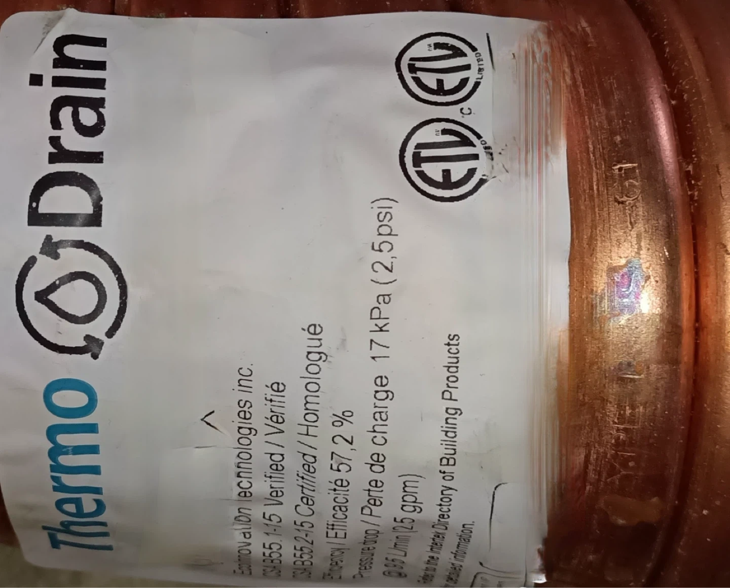 This is a ThermoDrain heat recovery unit made of copper. It has patent-pending, factory-installed PEX fittings for easier installation. It's designed to collect more heat energy from draining water. Multiple units can be placed in series.