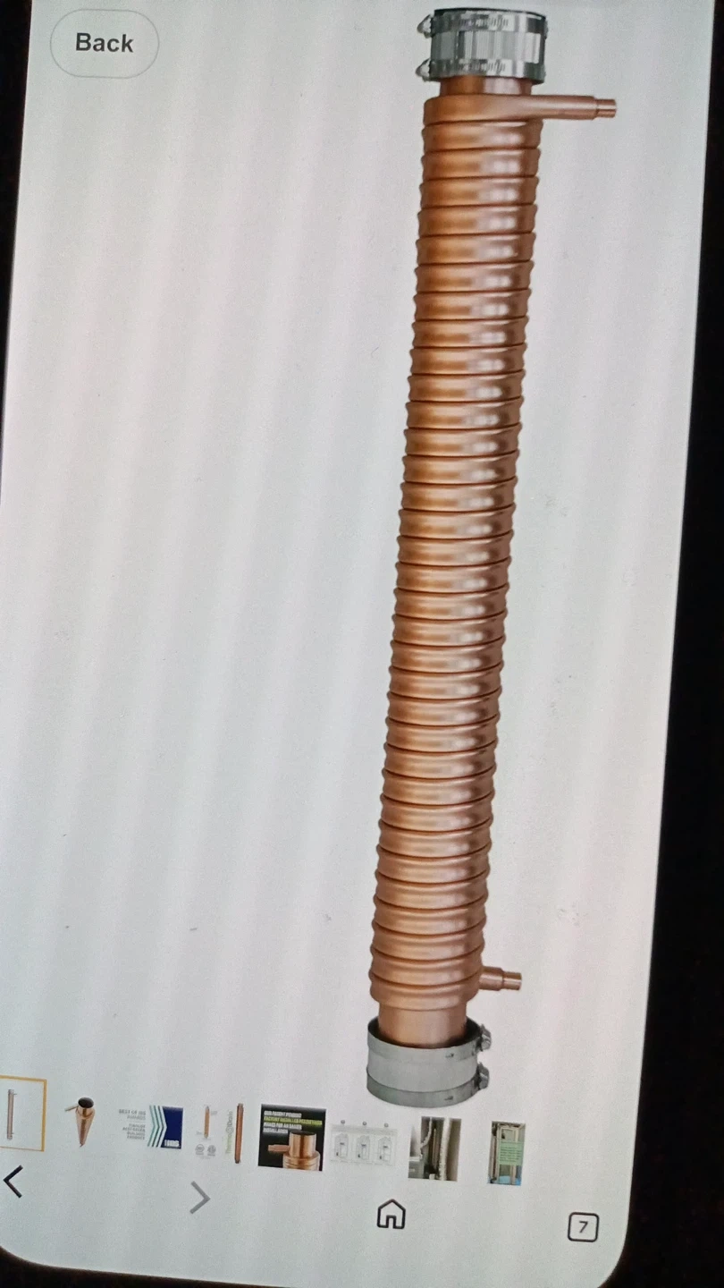 This is a ThermoDrain heat recovery unit made of copper. It has patent-pending, factory-installed PEX fittings for easier installation. It's designed to collect more heat energy from draining water. Multiple units can be placed in series.