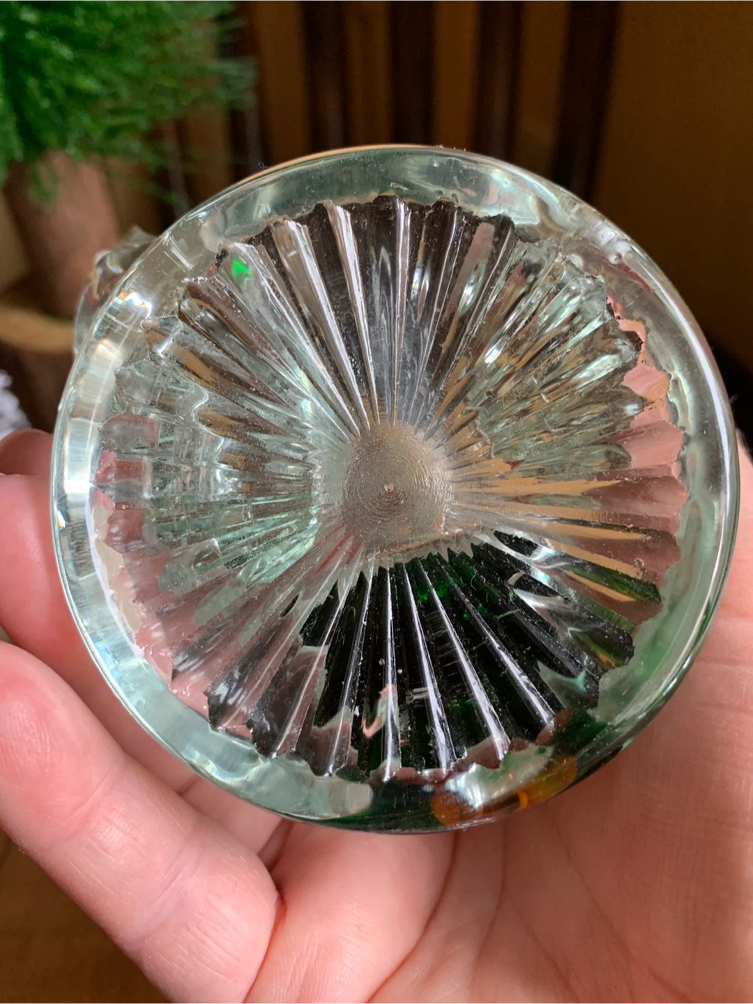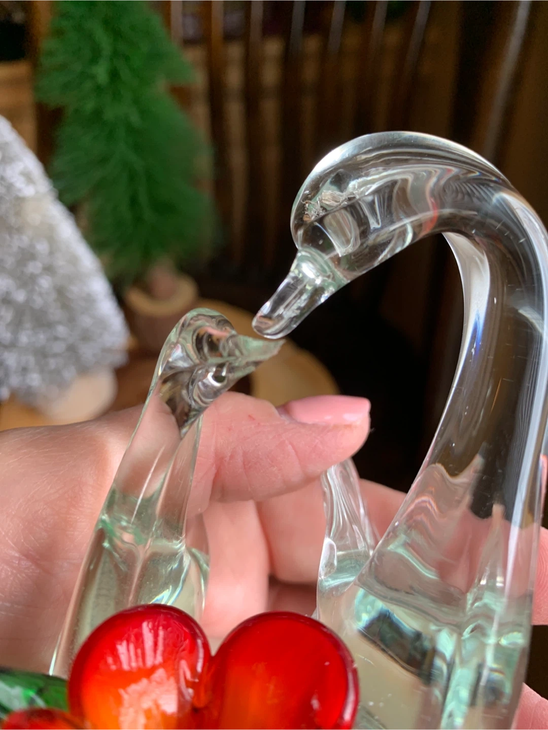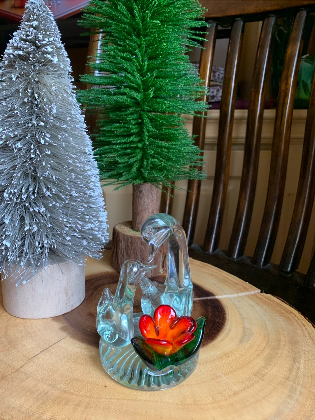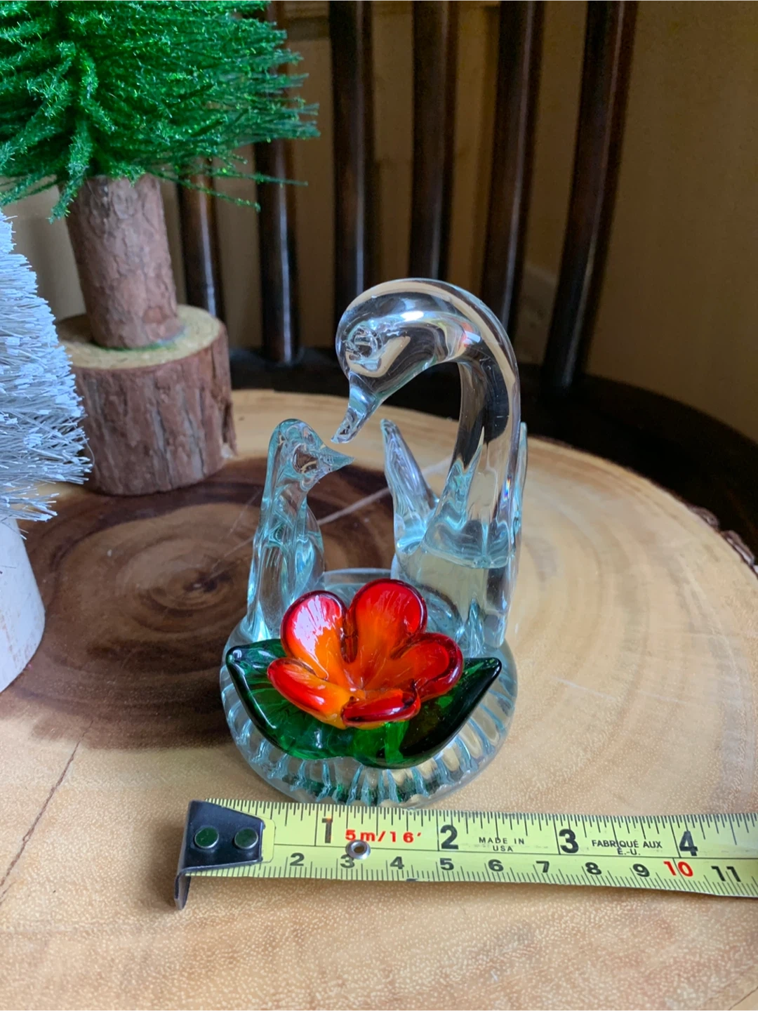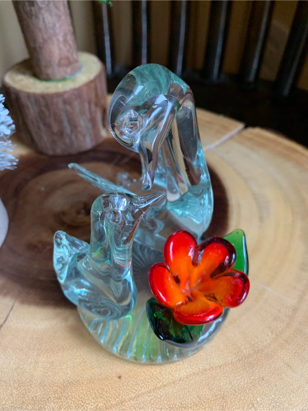 Hey swan lovers…here’s a lovely glass figurine featuring two swans with their necks curved towards each other, holding a red and orange flower. This piece is made of clear glass with a vibrant floral accent. Its detailed base has a sunburst pattern pressed into the glass. I’m not sure of the maker. One little disclaimer on the smaller or baby swan, there may be a small chip in the beak but very hard to find and not noticeable from afar. This would look cute on a bookshelf stack or could be used as a pretty paperweight as it has some good weight to it.