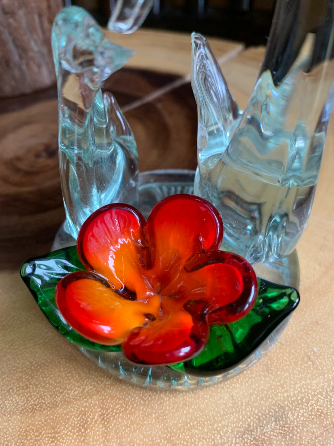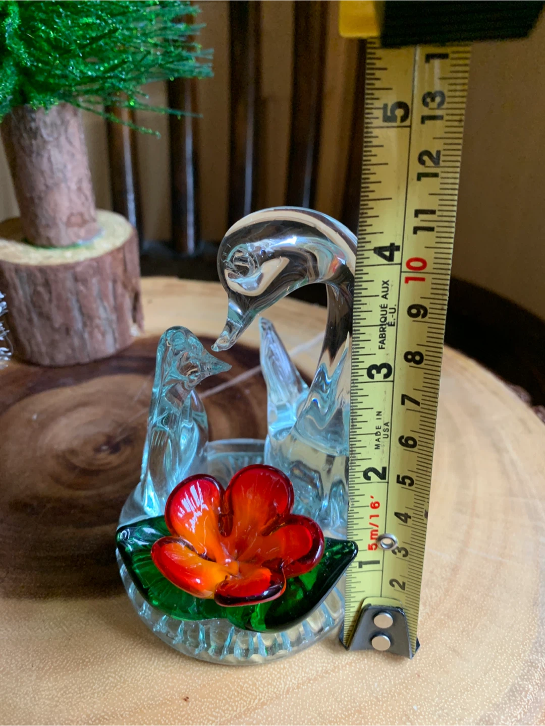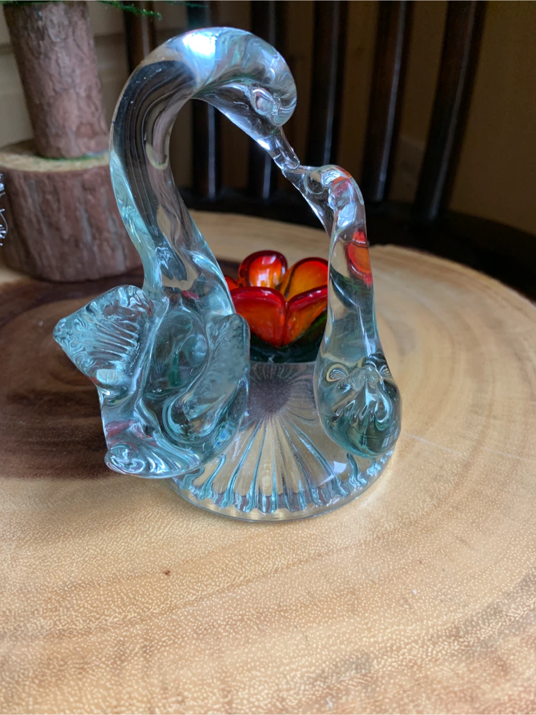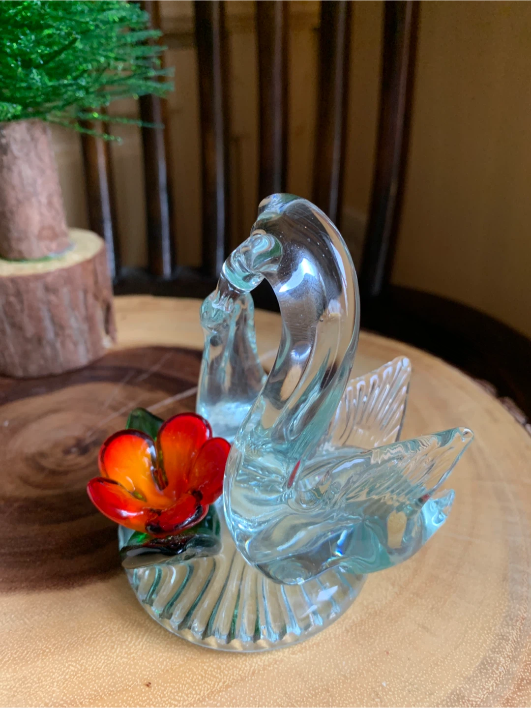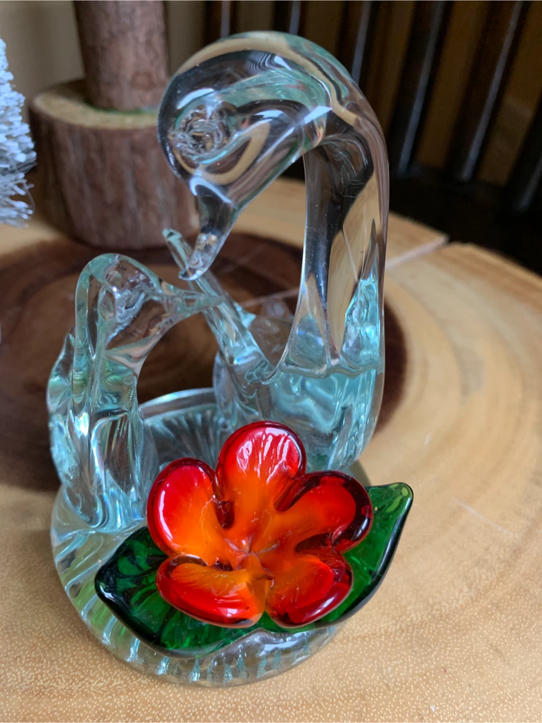 Hey swan lovers…here’s a lovely glass figurine featuring two swans with their necks curved towards each other, holding a red and orange flower. This piece is made of clear glass with a vibrant floral accent. Its detailed base has a sunburst pattern pressed into the glass. I’m not sure of the maker. One little disclaimer on the smaller or baby swan, there may be a small chip in the beak but very hard to find and not noticeable from afar. This would look cute on a bookshelf stack or could be used as a pretty paperweight as it has some good weight to it.