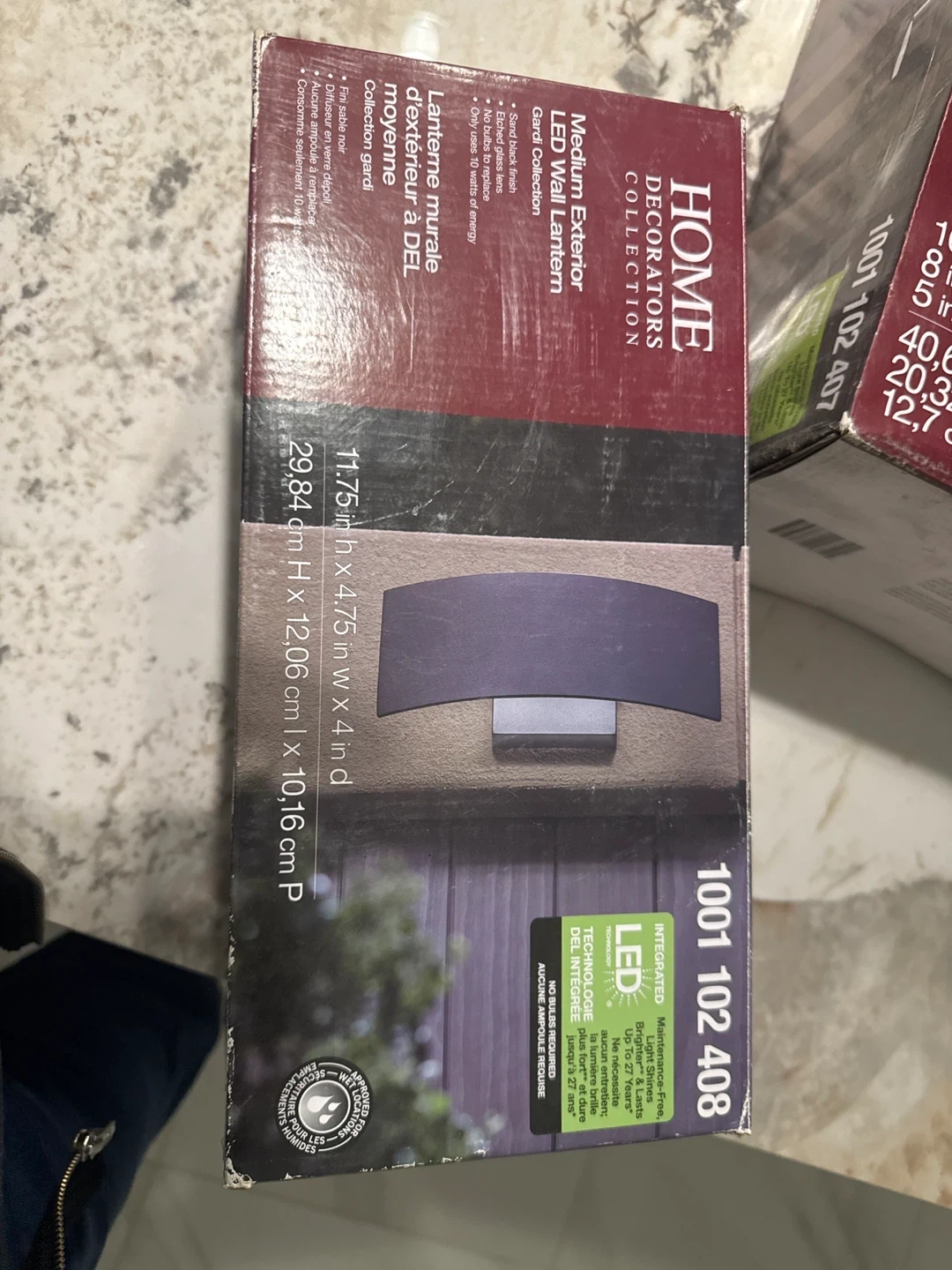This is a Home Decorators Collection medium exterior LED wall lantern with a sand black finish and etched glass lens. It uses only 10 watts of energy and has a maintenance-free design that lasts up to 27 years. It's useful for providing exterior lighting.