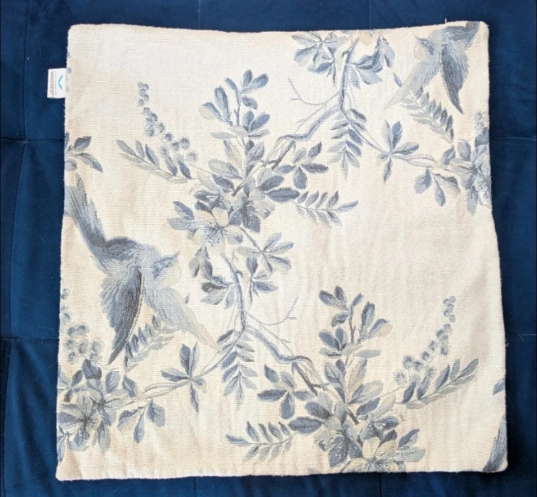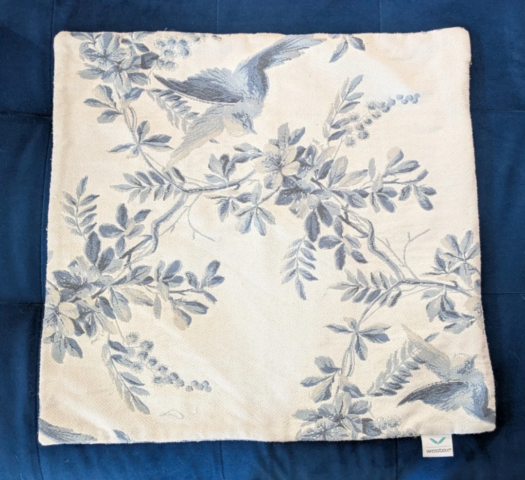This Westex toile pillow cover with zipper closure has a blue bird and floral pattern an off-white background. It's a lovely accent piece for any couch or chair and in good used condition. Size is 20x 20