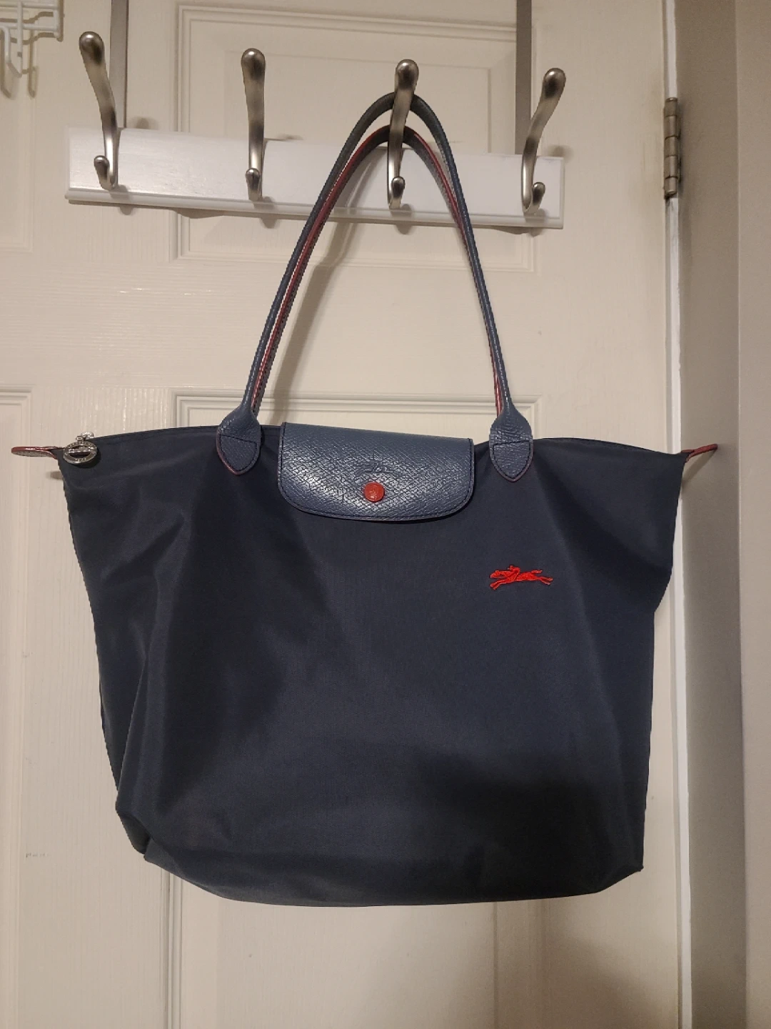 This is a beautiful Longchamp Le Pliage tote bag in a navy colour. It has leather trim and handles. It's a classic and versatile bag for everyday use!
