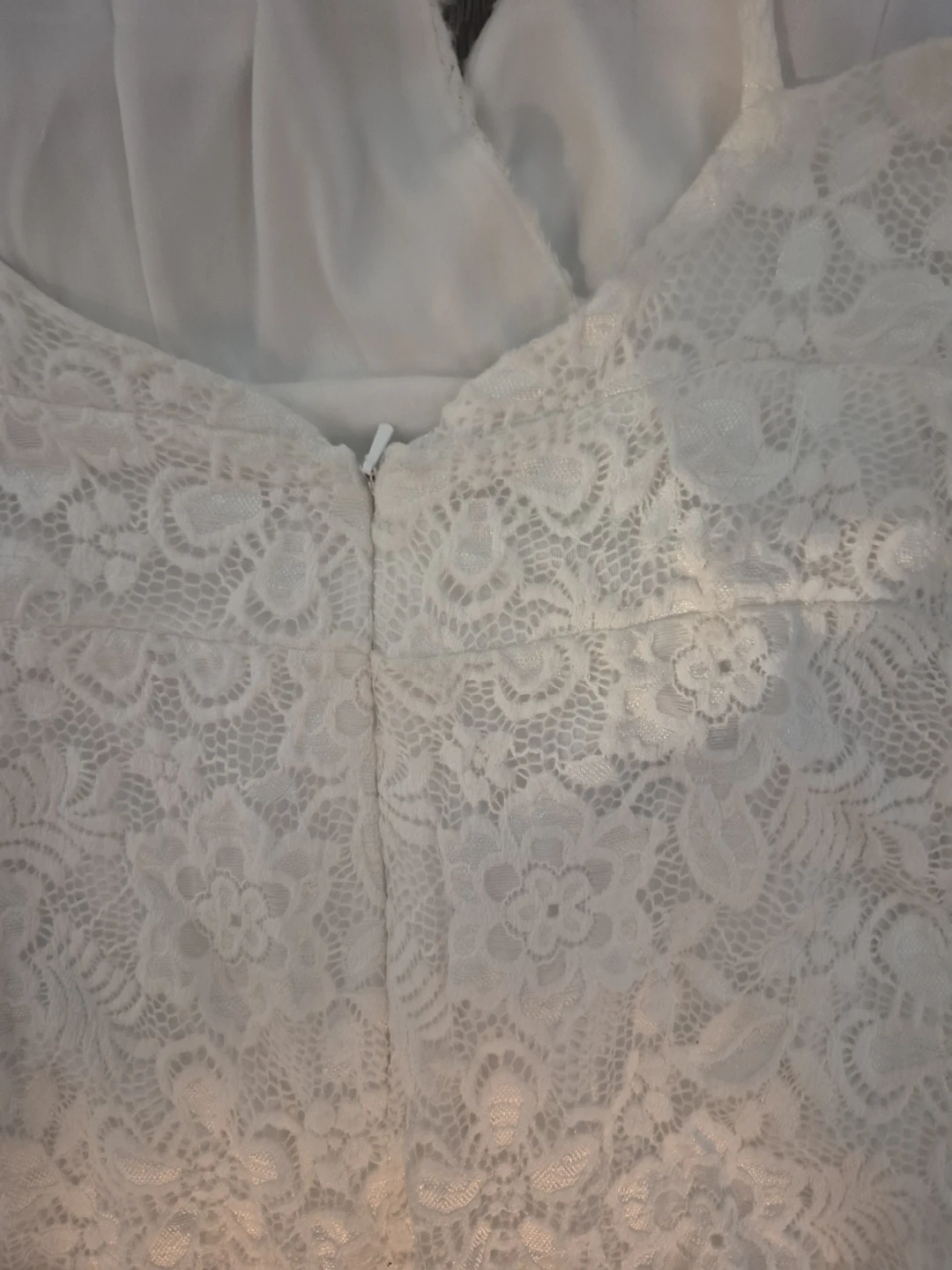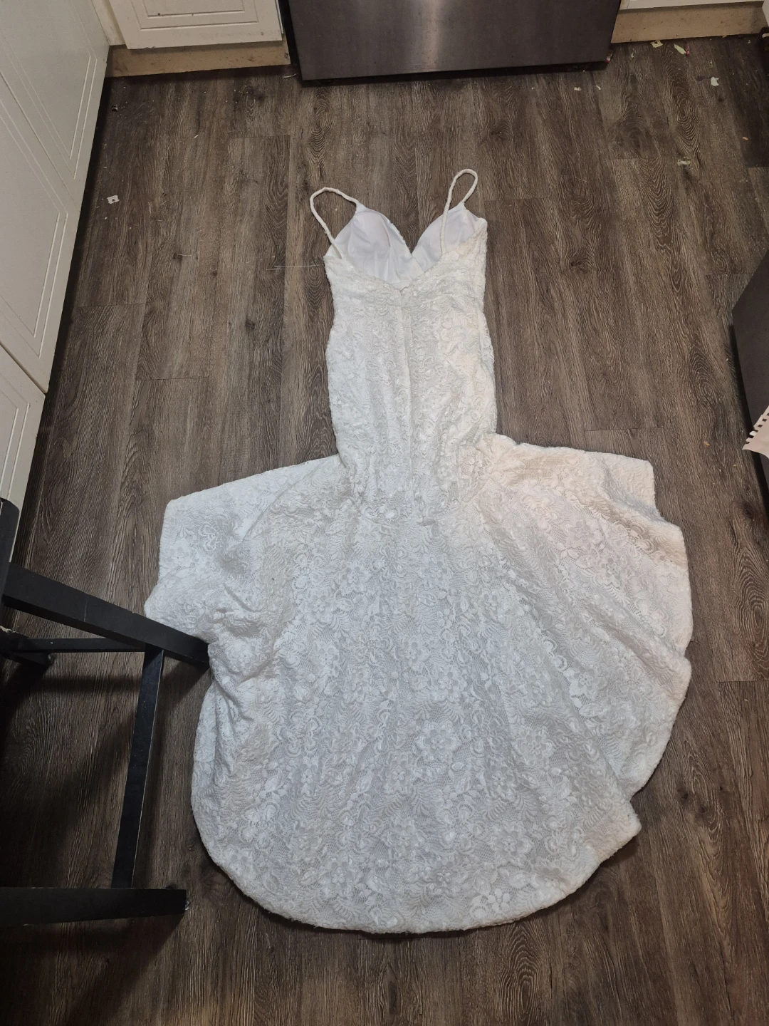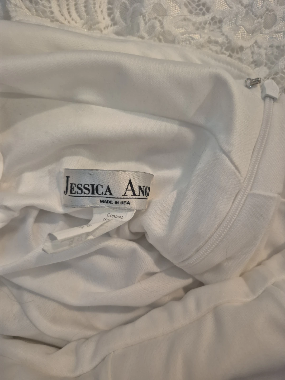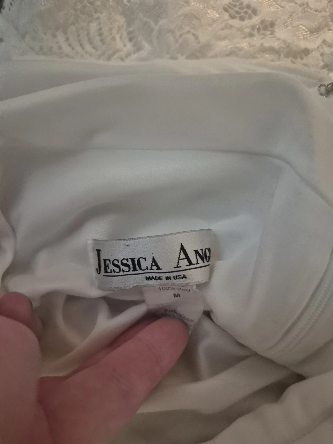 This Jessica Angel gown is white with intricate lace detailing. It's a size medium and made of 100% polyester. It features a mermaid silhouette with a ruffled train. This dress would be beautiful for a wedding or formal event!