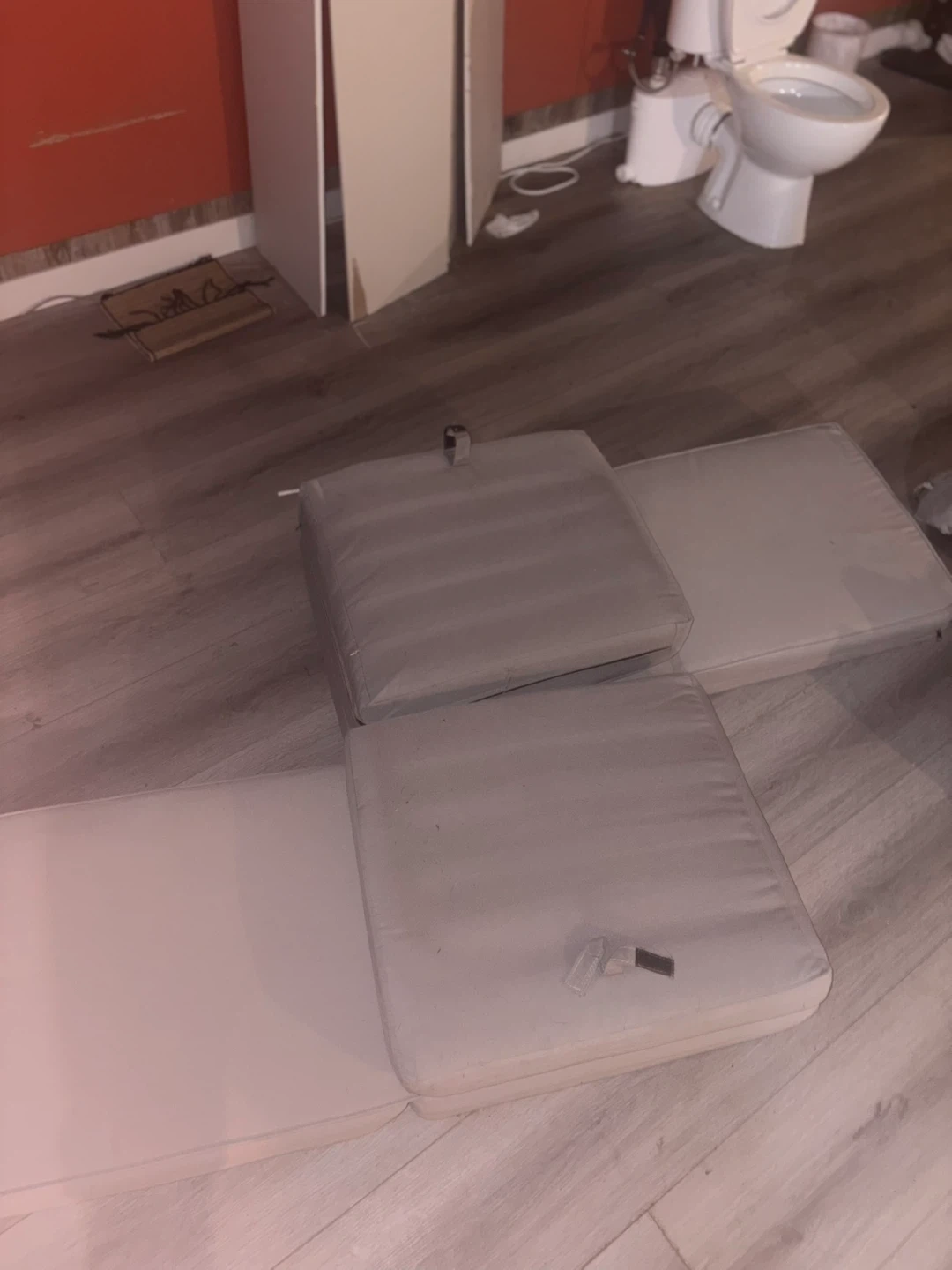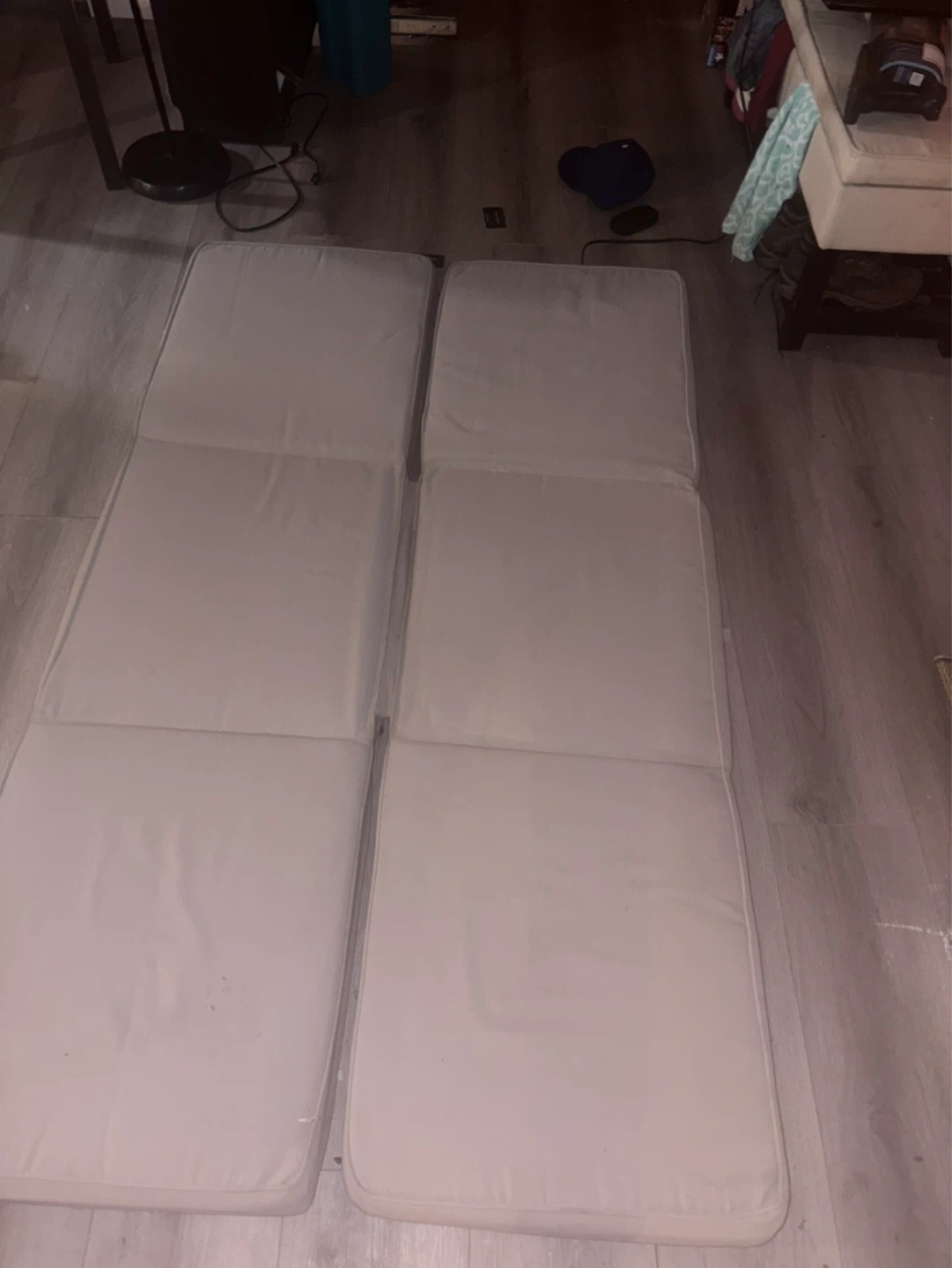 Two chaise lounge cushions in a neutral beige/grey colour. They're padded for comfort and seem to be weather-resistant. Straps are attached to secure them.