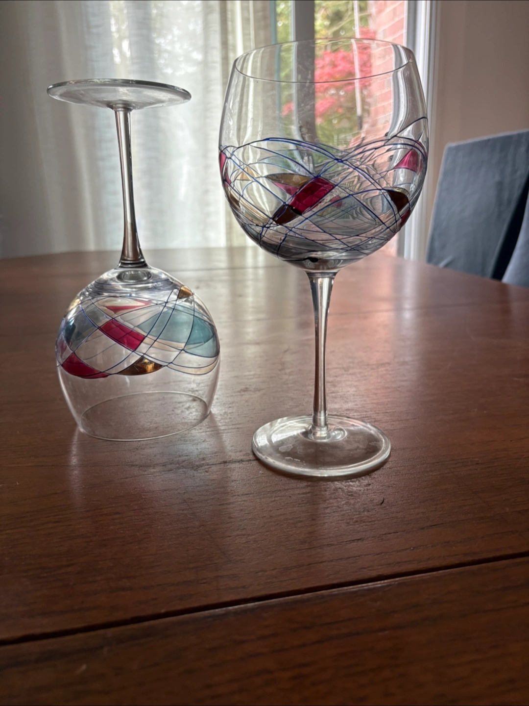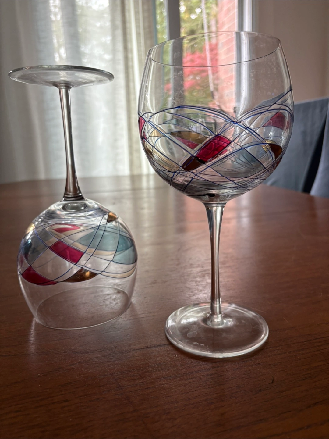 Selling 9 painted wine glasses! They have a unique design with red, blue, and silver accents. Perfect for adding a touch of elegance to your dining table or as a gift for a wine lover.