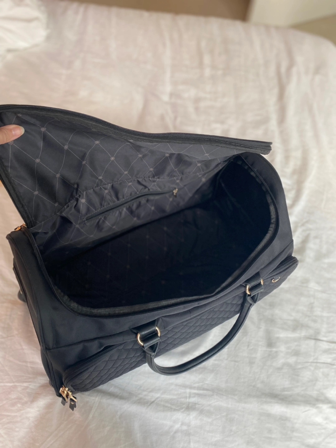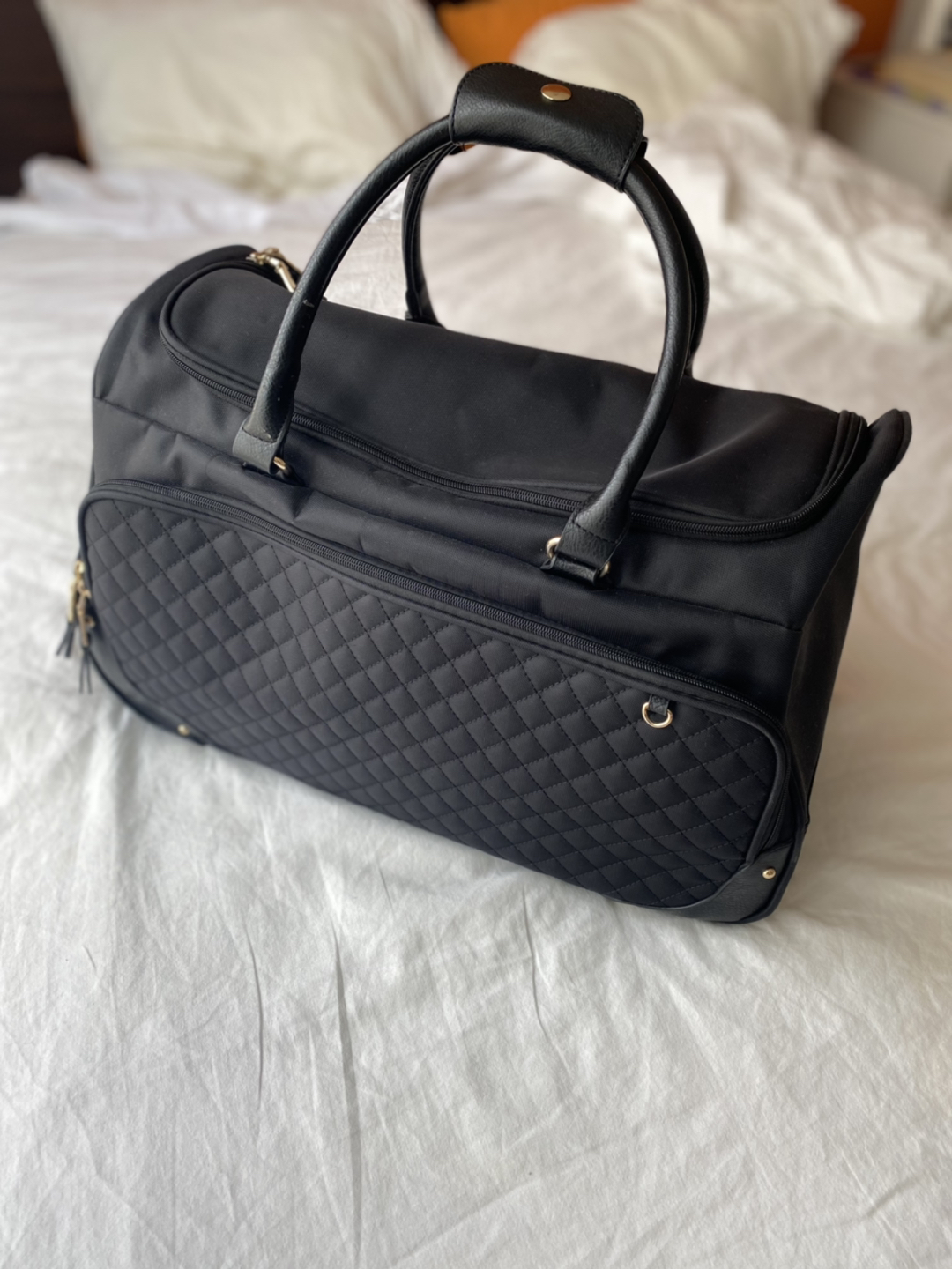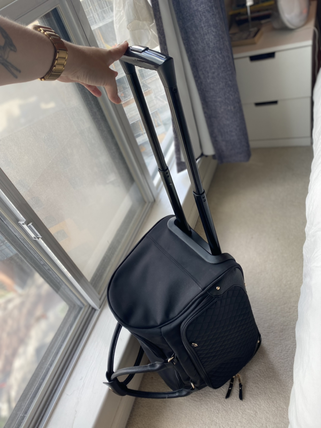 Black weekender or travel bag, has wheels and long handle so can be pulled like a suitcase.