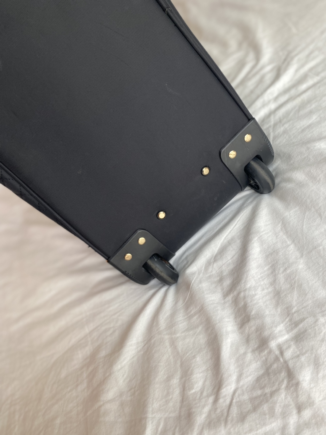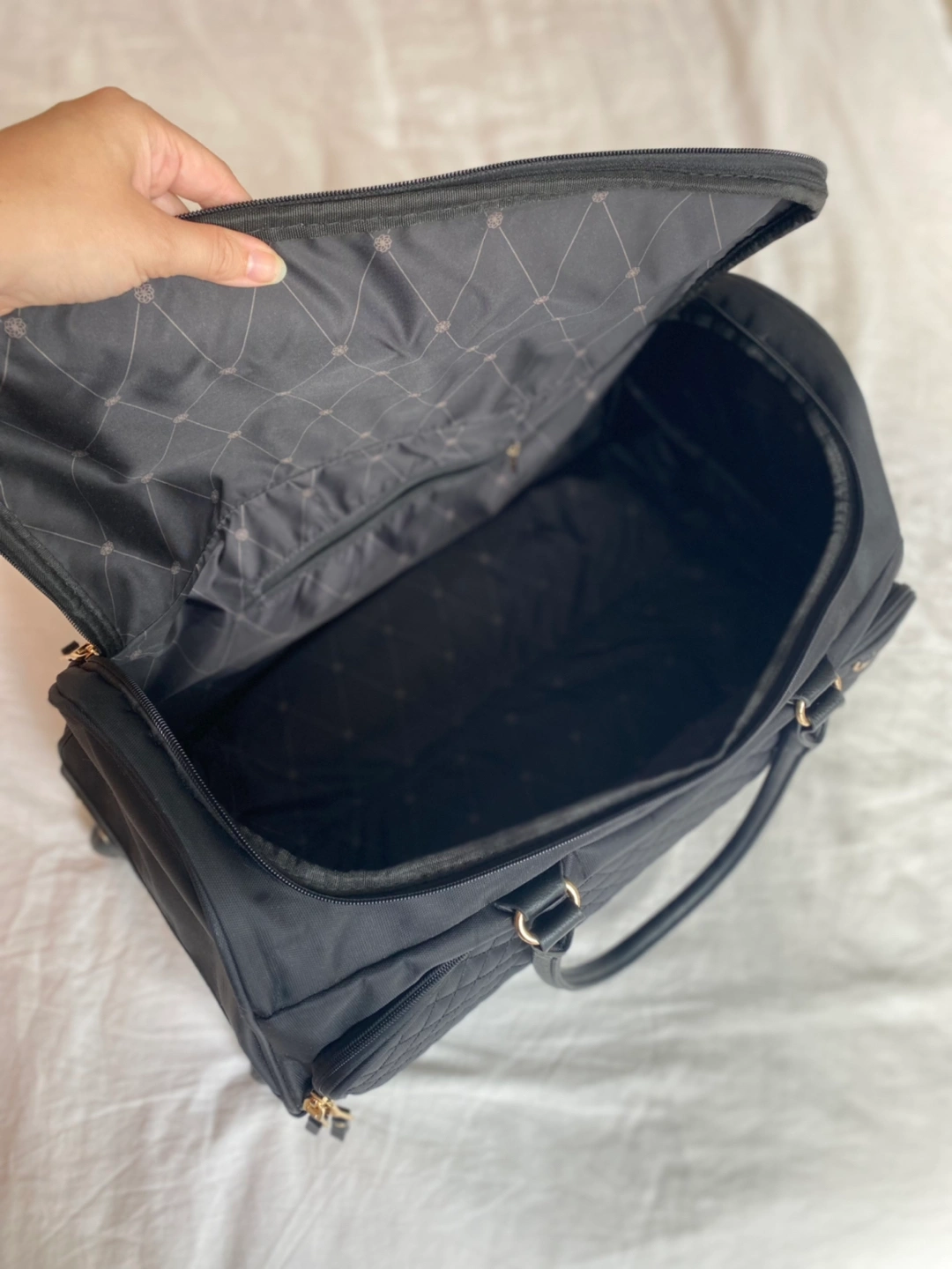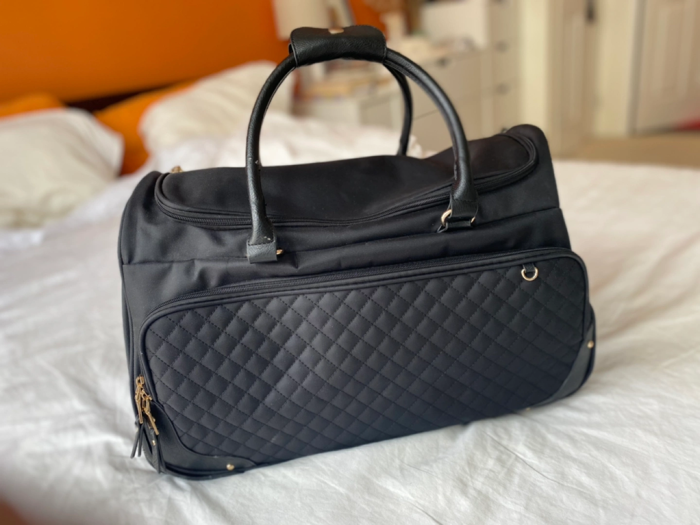 Black weekender or travel bag, has wheels and long handle so can be pulled like a suitcase.