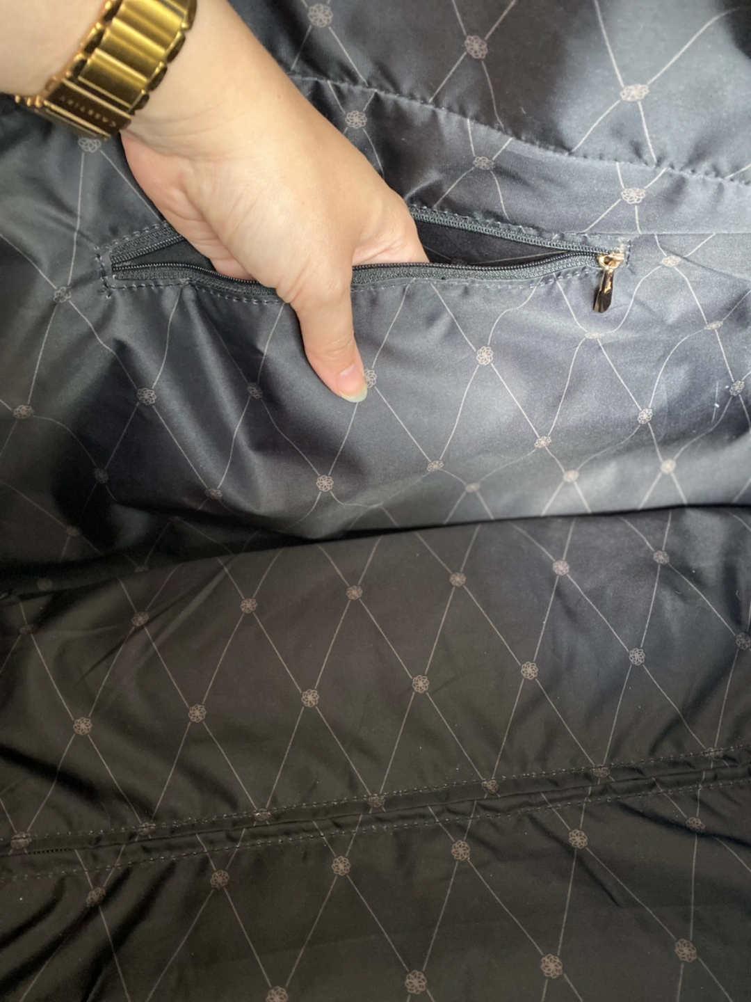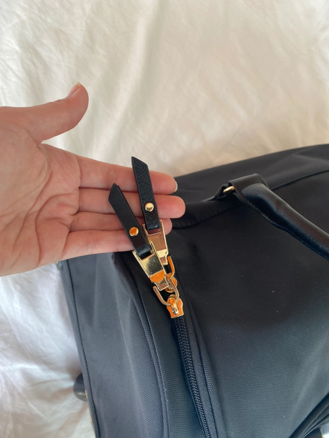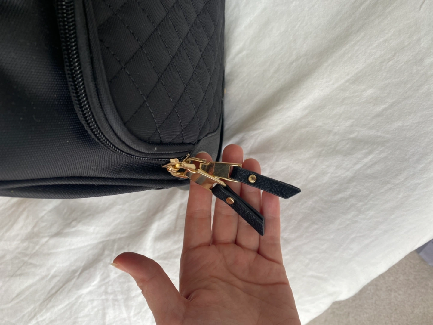 Sturdy, gold coloured zipper pulls. One pocket inside. Used it once, brand new.