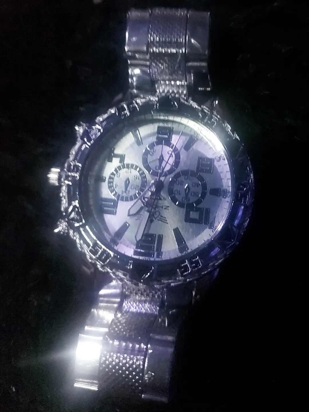 This is a men's silver-toned chronograph watch. It has a metal band and a silver dial with three sub-dials. The watch has a bold, textured bezel. This watch would be suitable for daily wear or for special occasions.