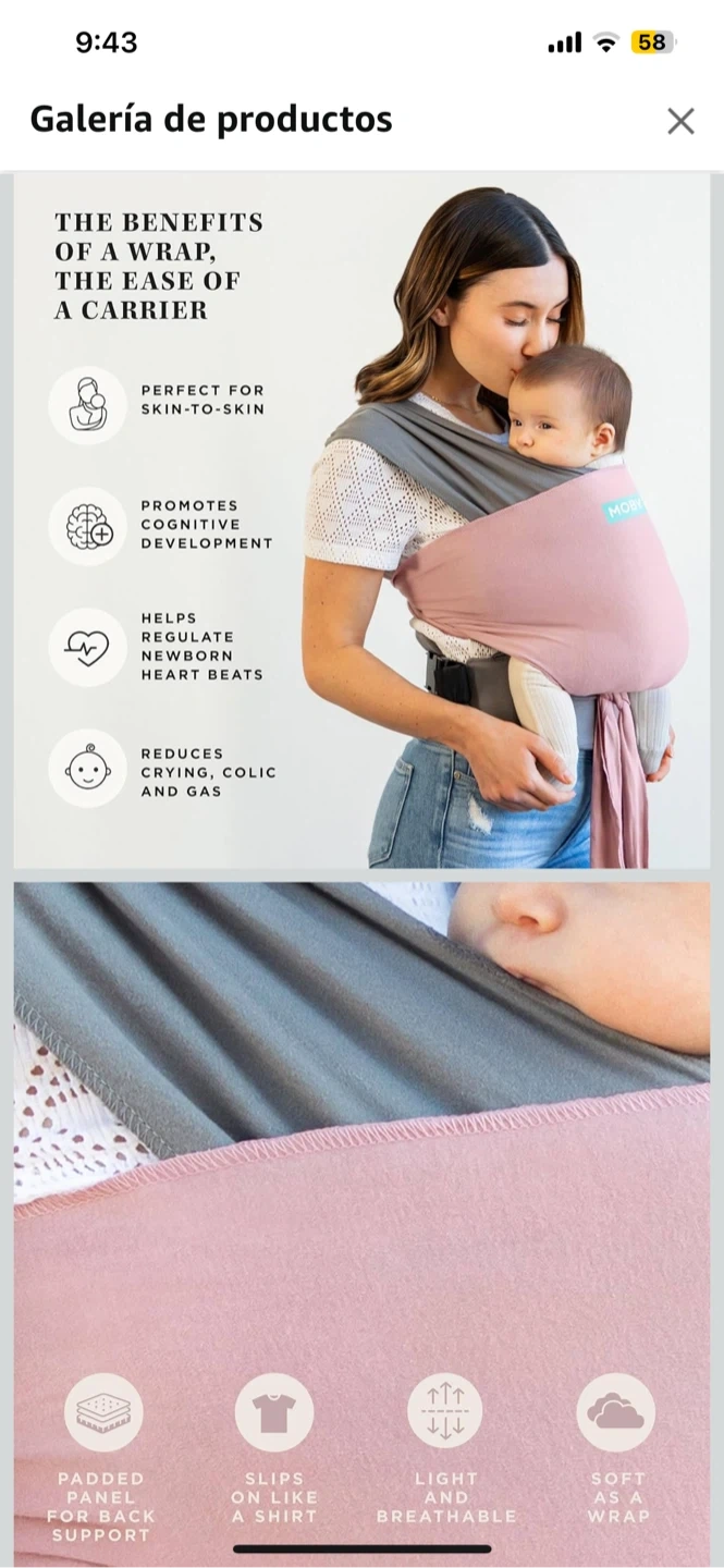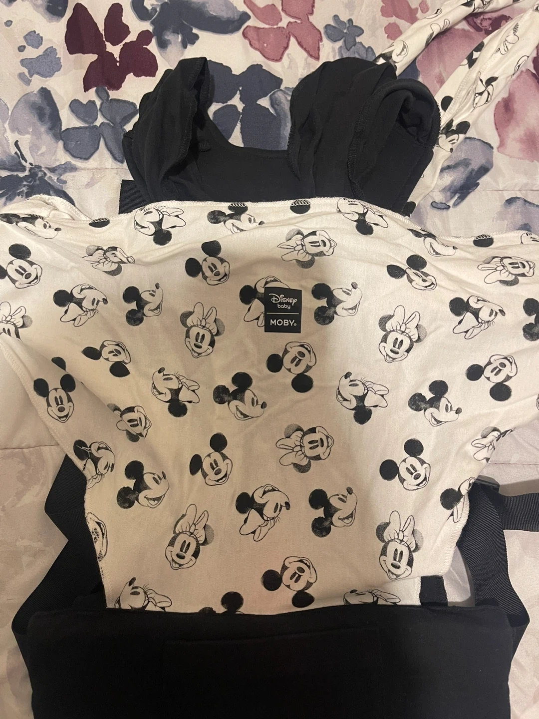 I'm selling a Moby baby wrap carrier with a cute Disney print! It's perfect for skin-to-skin contact and promotes cognitive development. It's also designed to help regulate newborn heartbeats and reduce crying, colic, and gas. The wrap is light and breathable, and slips on like a shirt.
