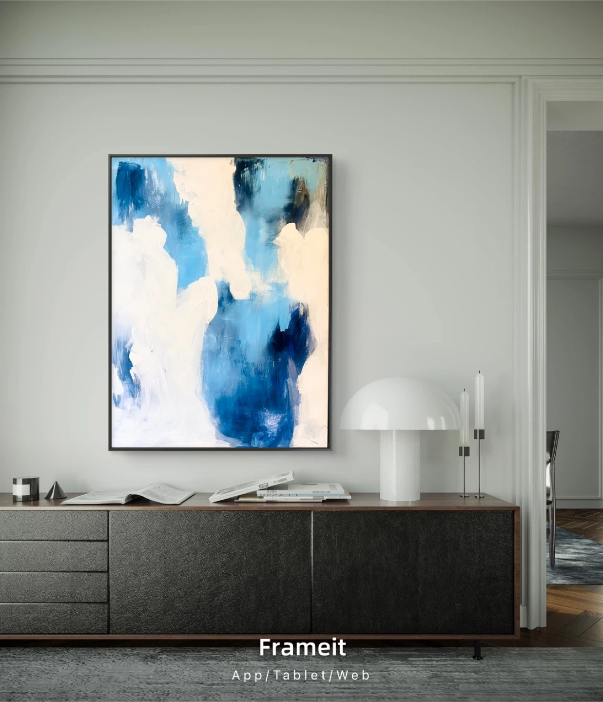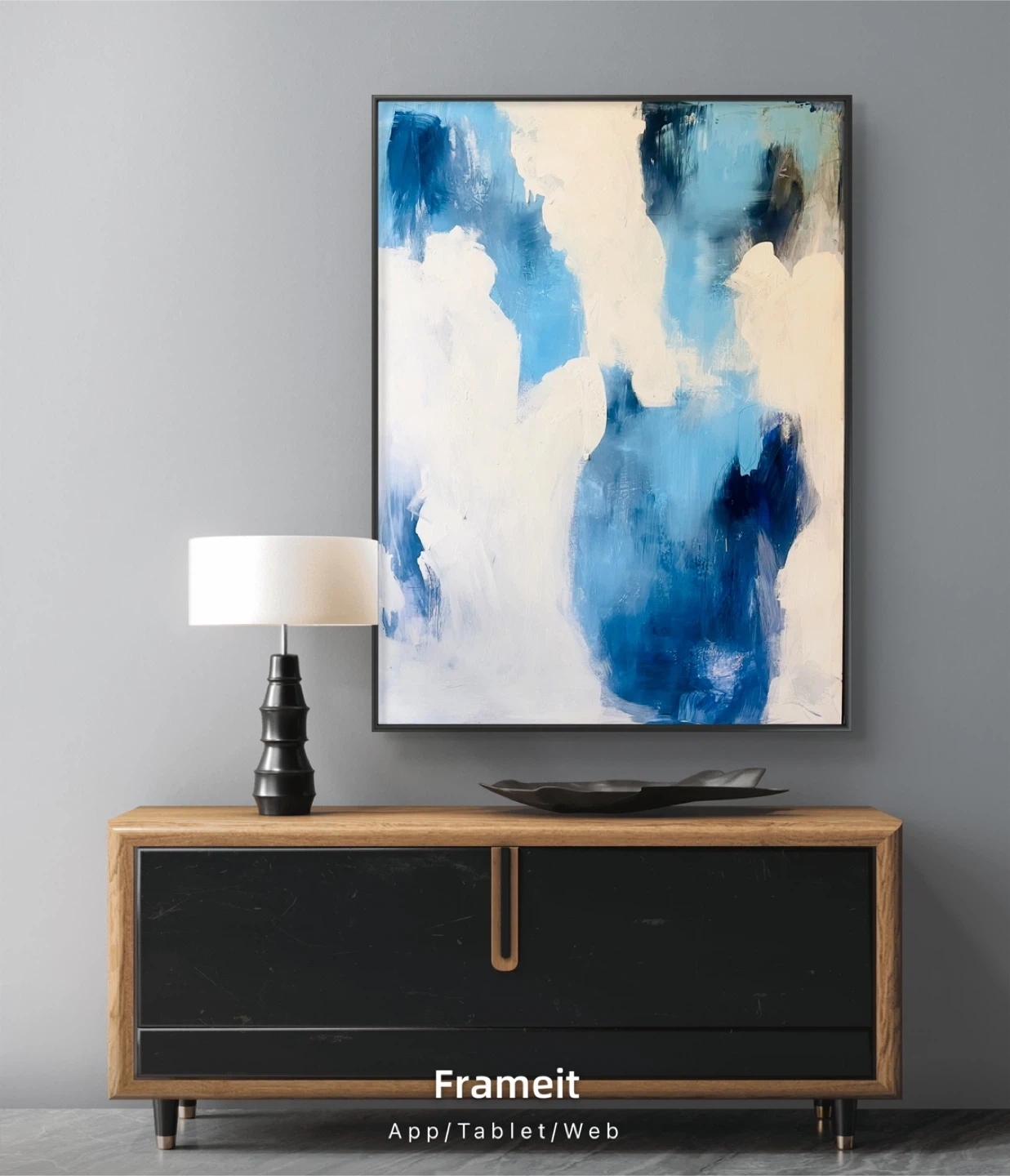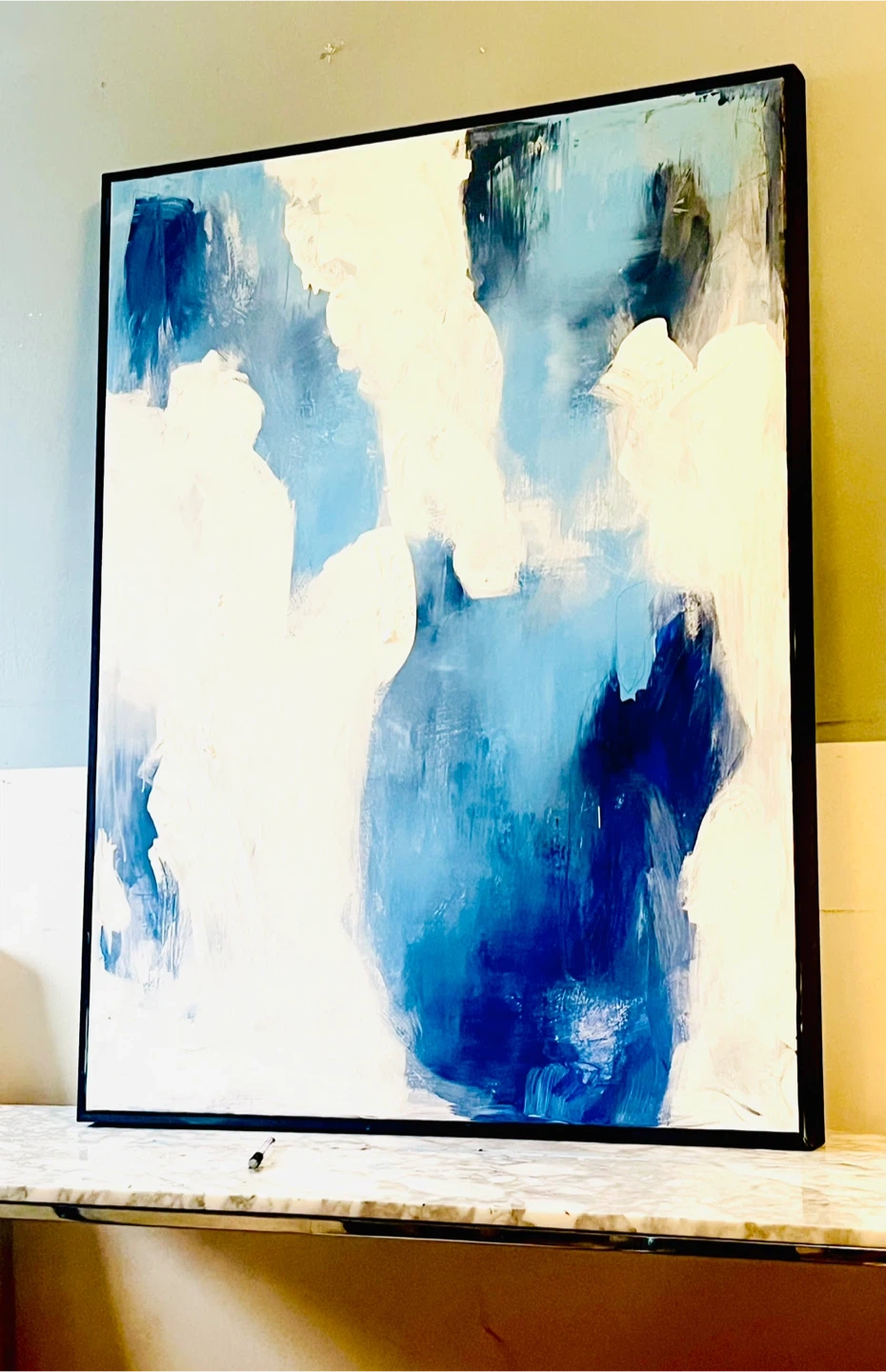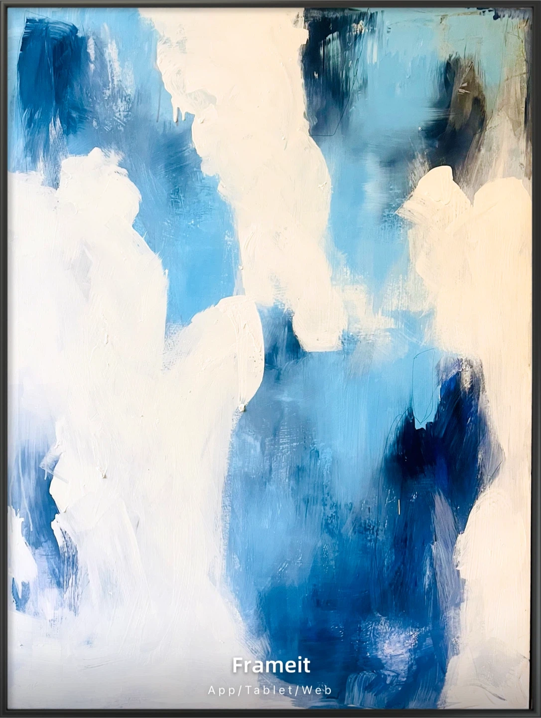 Beautiful original abstract painting featuring shades of blue and white. It's framed in a black modern frame, ready to hang. This piece adds a modern touch to any room!