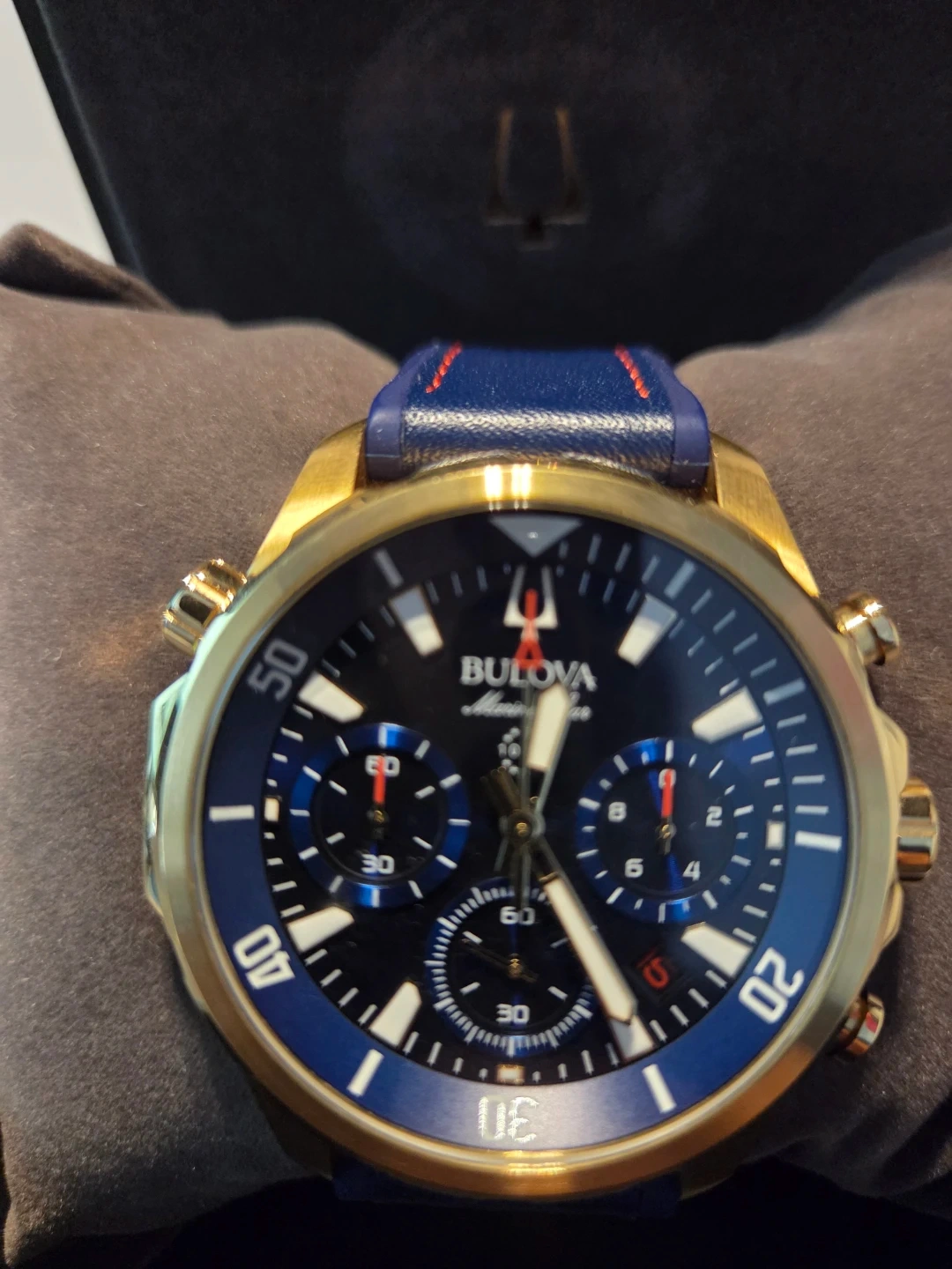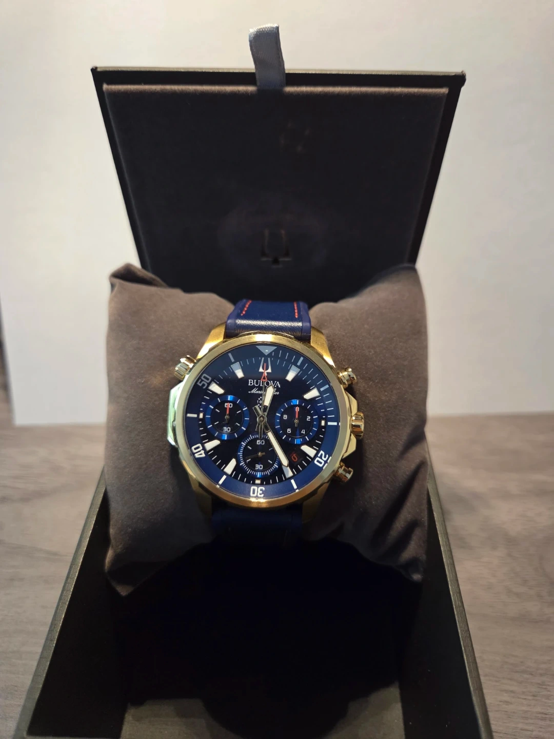 Buy & SellBulova Marine Star Chronograph WatchBulova Marine Star Chronograph Watch$235This is a Bulova Marine Star chronograph watch. It's gold-toned with a blue dial and a blue band. Water resistant 100m. Includes the original box.ConditionNewBrandBulovaWHERE TO MEETPickeringView MapSELLERverifiedAndrewBrock Ridge600 reviews2 chats·2 favorites·37 viewsSEND CHAT TO SELLERHi Andrew! I’m interested in your listing.Hi Andrew! I’m interested in your listing.Get the Karrot app to chatSign In to chat