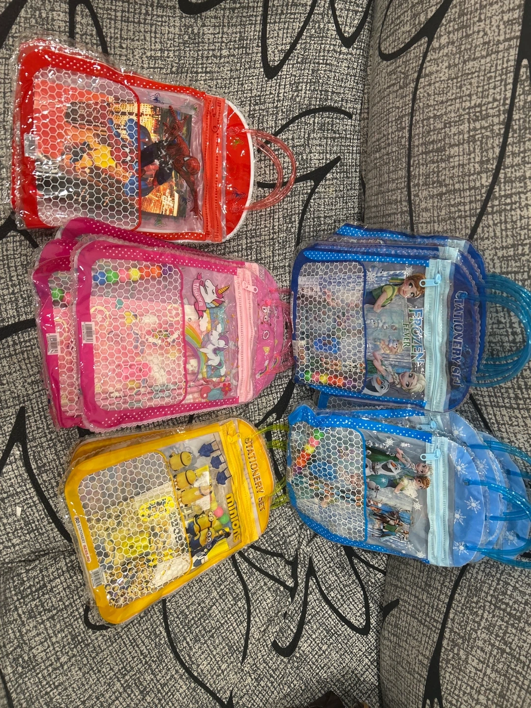 There are different themes, including Spiderman, Frozen, Minions, and Unicorn. They are all brand new and a great return gift for birthday parties.