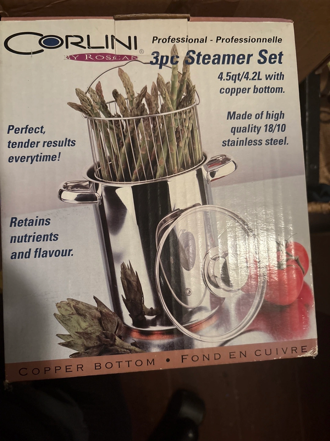 Corlini 3 piece steamer set with a 4.2L capacity and copper bottom. Made of high quality 18/10 stainless steel. This set is ideal for steaming asparagus, corn, and artichokes.