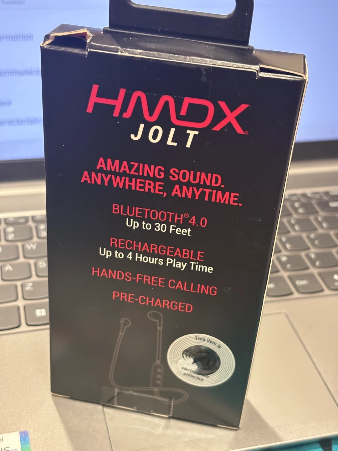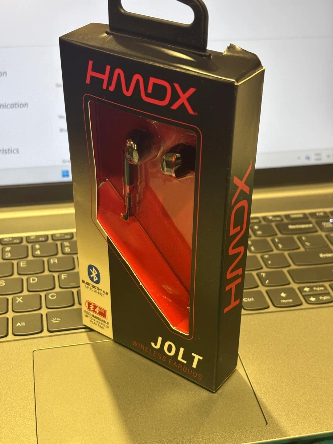 These HMDX JOLT wireless earbuds connect via Bluetooth 4.0 and offer up to 30 feet of range. They're rechargeable and provide up to 4 hours of play time. Hands-free calling is supported. This item comes pre-charged.