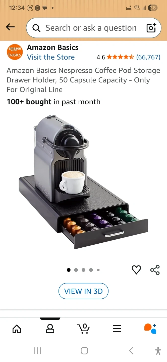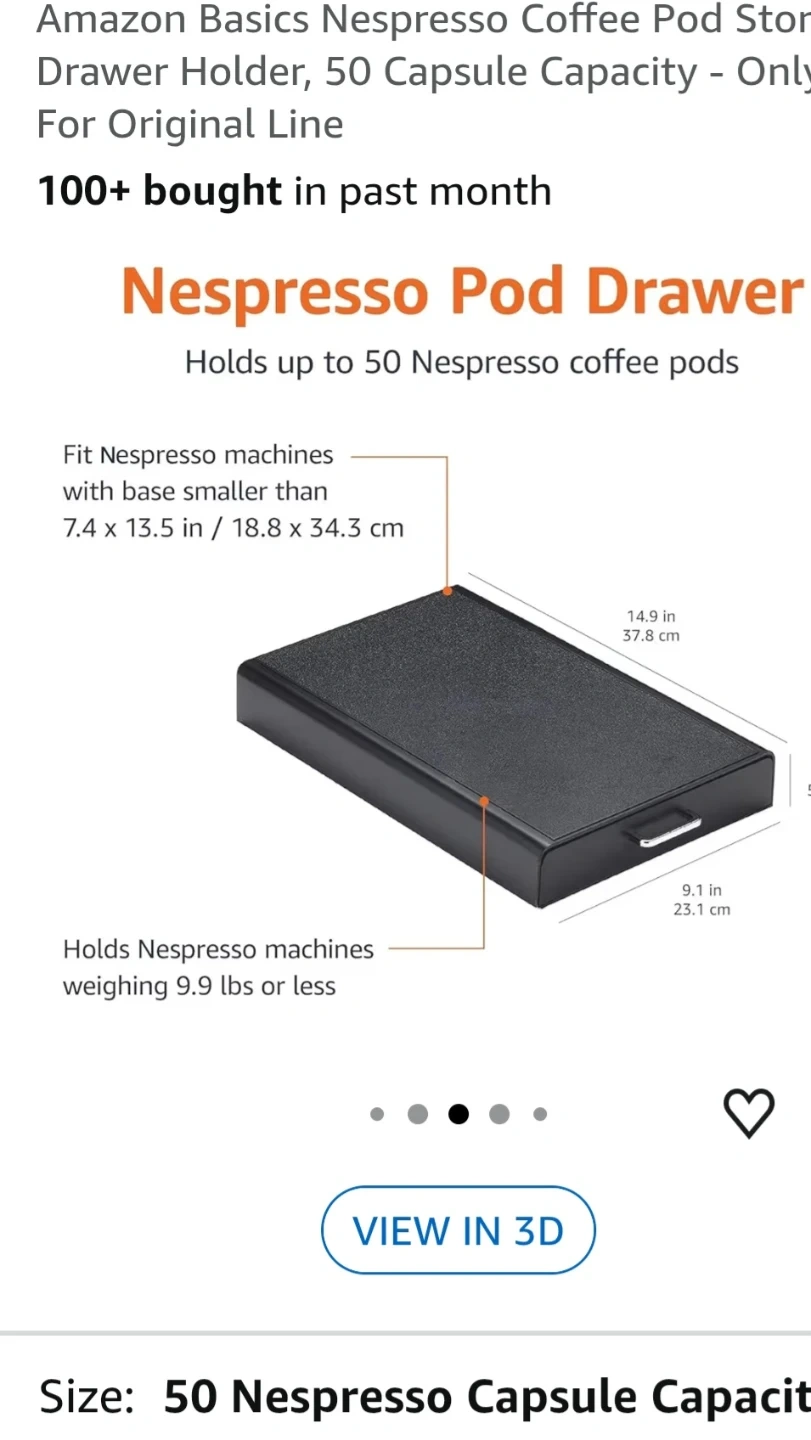 Brand new!!!! Still in box! This Amazon Basics drawer holder stores up to 50 Nespresso OriginalLine coffee pods. It's designed to fit Nespresso machines with a base smaller than 7.4 x 13.5 inches. The drawer slides out for easy access to your coffee pods.