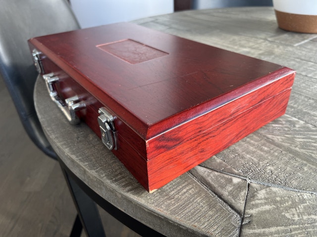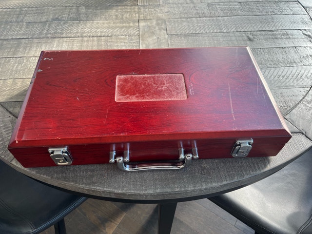 Elevate your game nights with this complete poker set, perfect for beginners and seasoned players alike! This set includes a full deck of cards, an assortment of chips, dice and a dealer button, all housed in a sturdy wooden case for easy storage and transport. This is a used set but it's still in great shape.