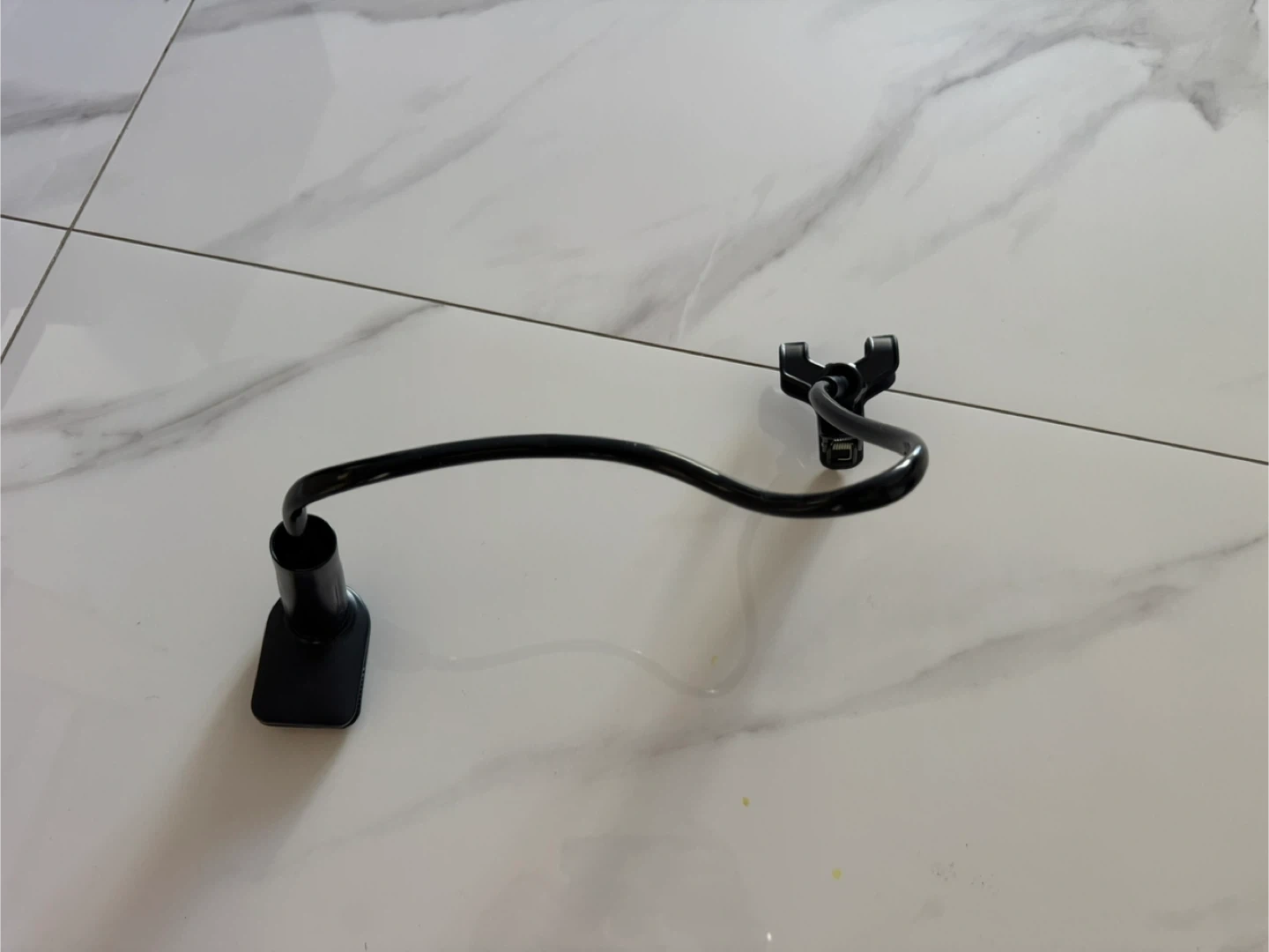 A flexible gooseneck phone holder with a clamp base. It's black and made of plastic and metal. This holder attaches to surfaces and has a clip to hold your phone securely.