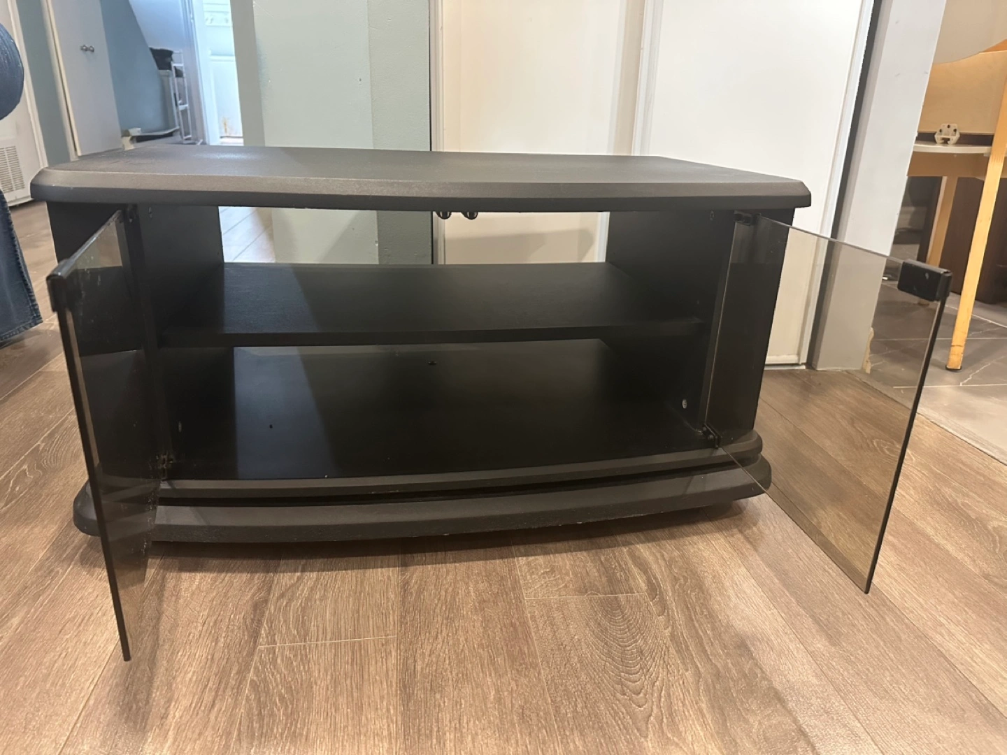 Black TV Stand with glass doors, one shelf (can be removed), and a curved front. You can spin it against the base.