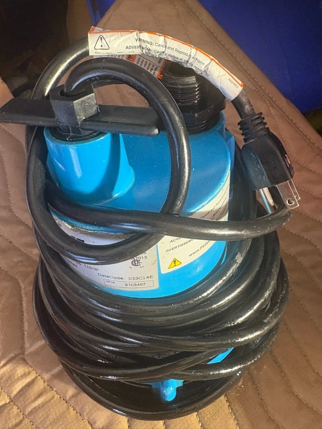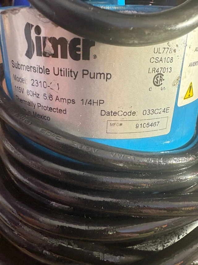 This Simer submersible utility pump is ideal for removing water from any location, such as a flooded basement or a pool, and it is in good used condition. This pump is a reliable and efficient solution for your water removal needs. I have tested the pump and it is fully functional. Specifications: