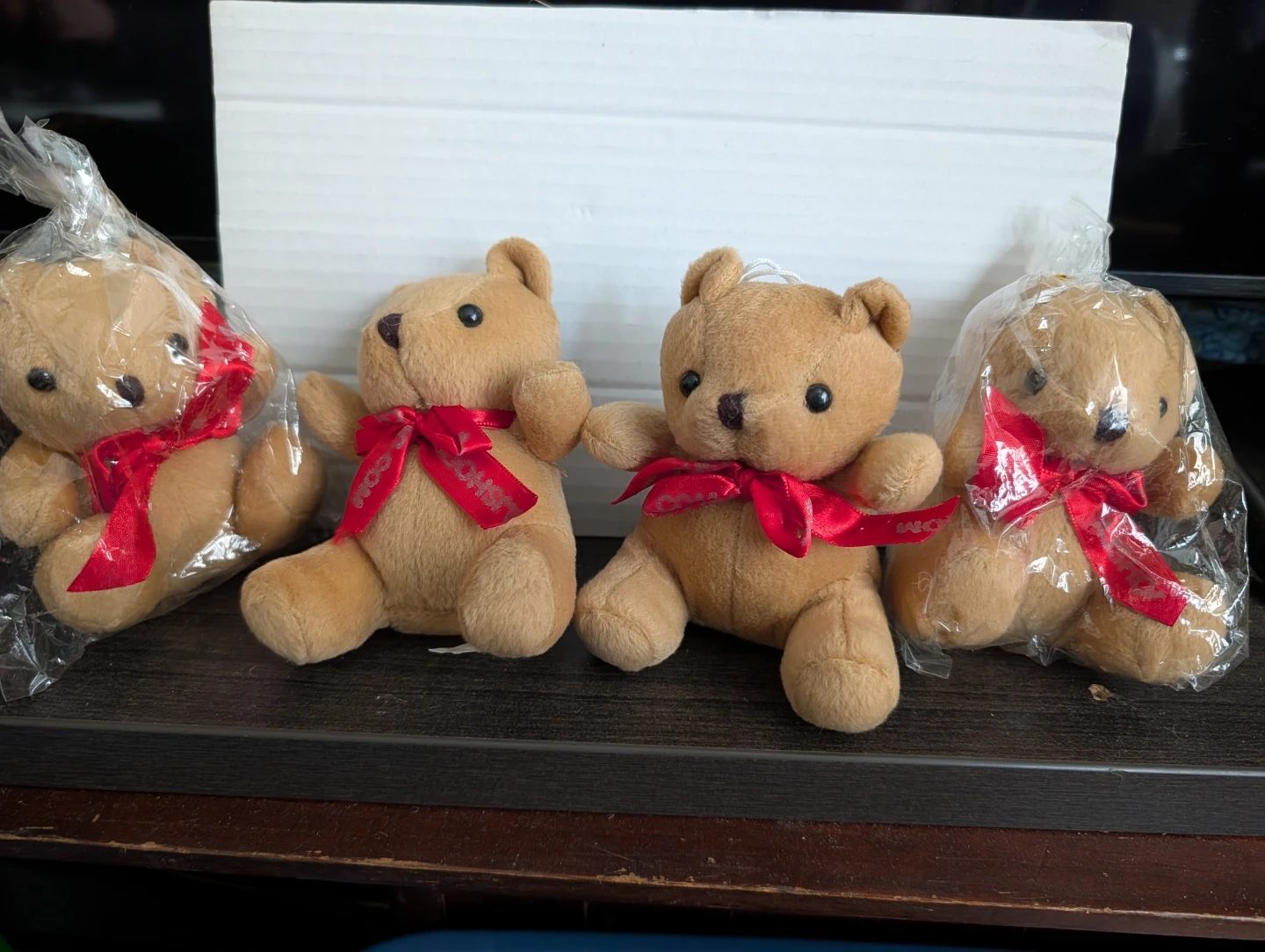 Four Small Teddy Bears with Red Ribbons