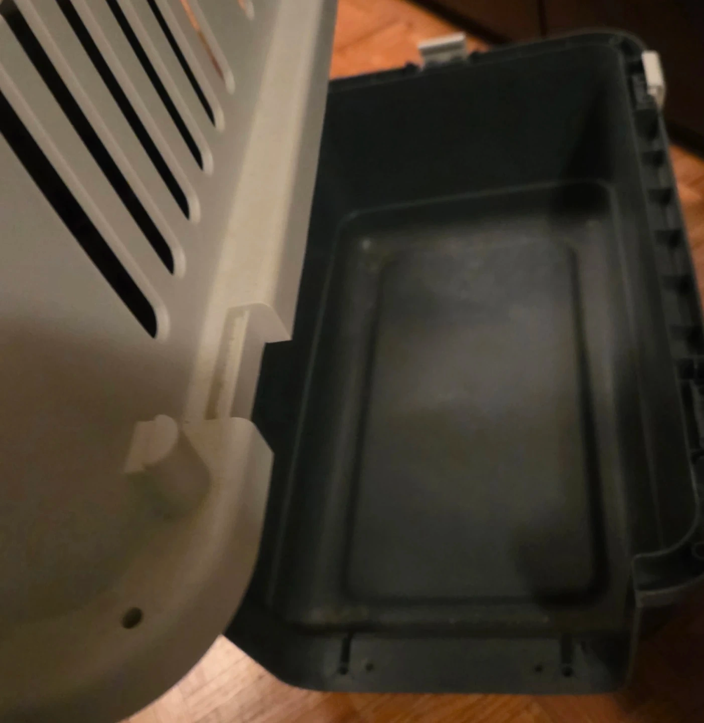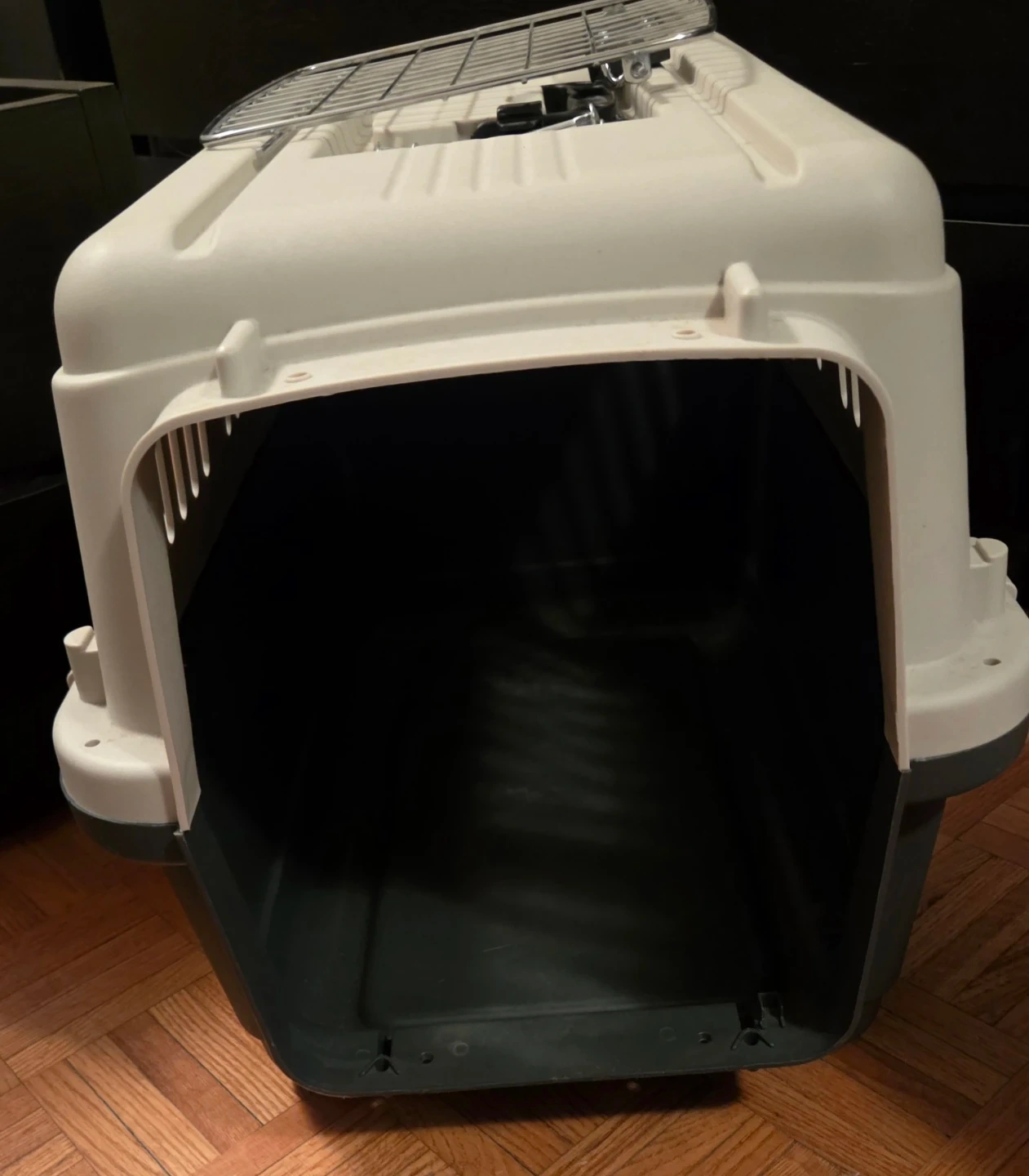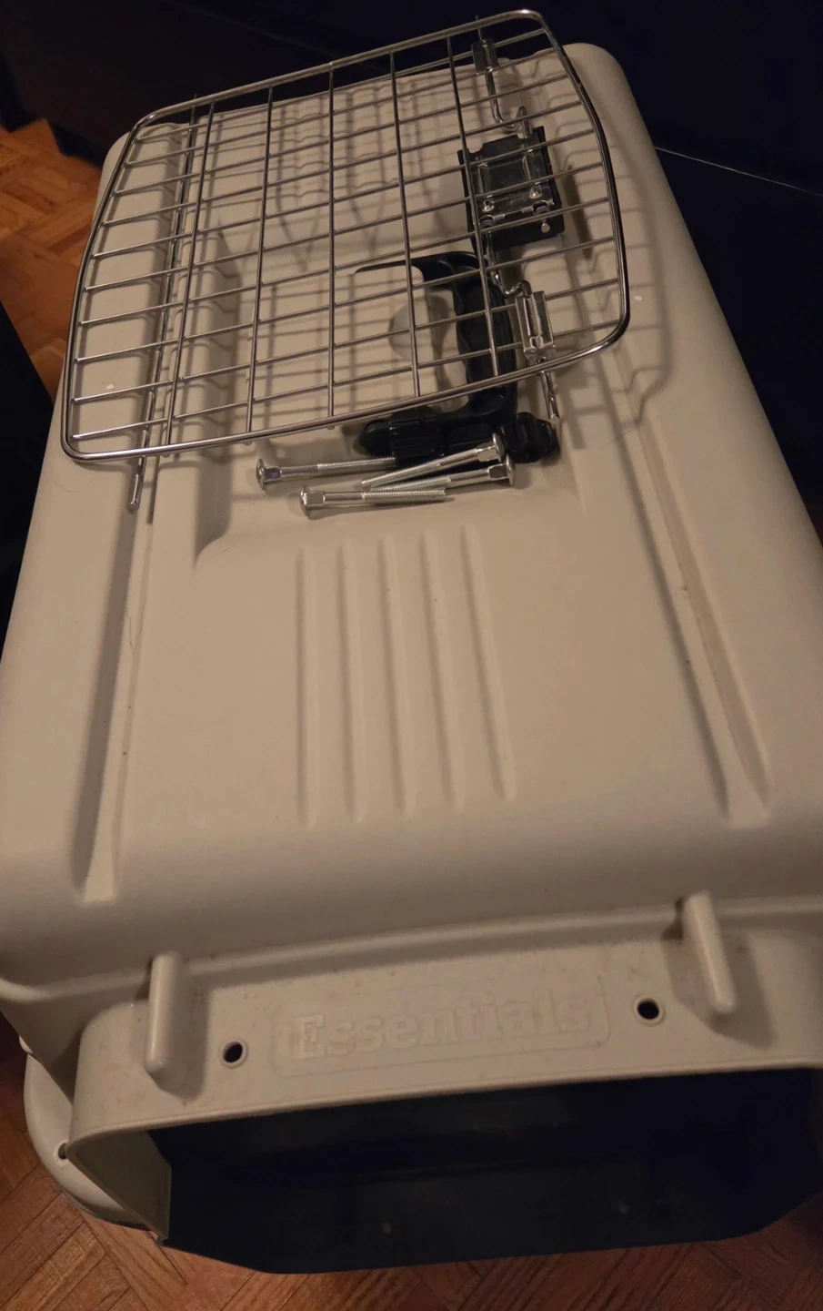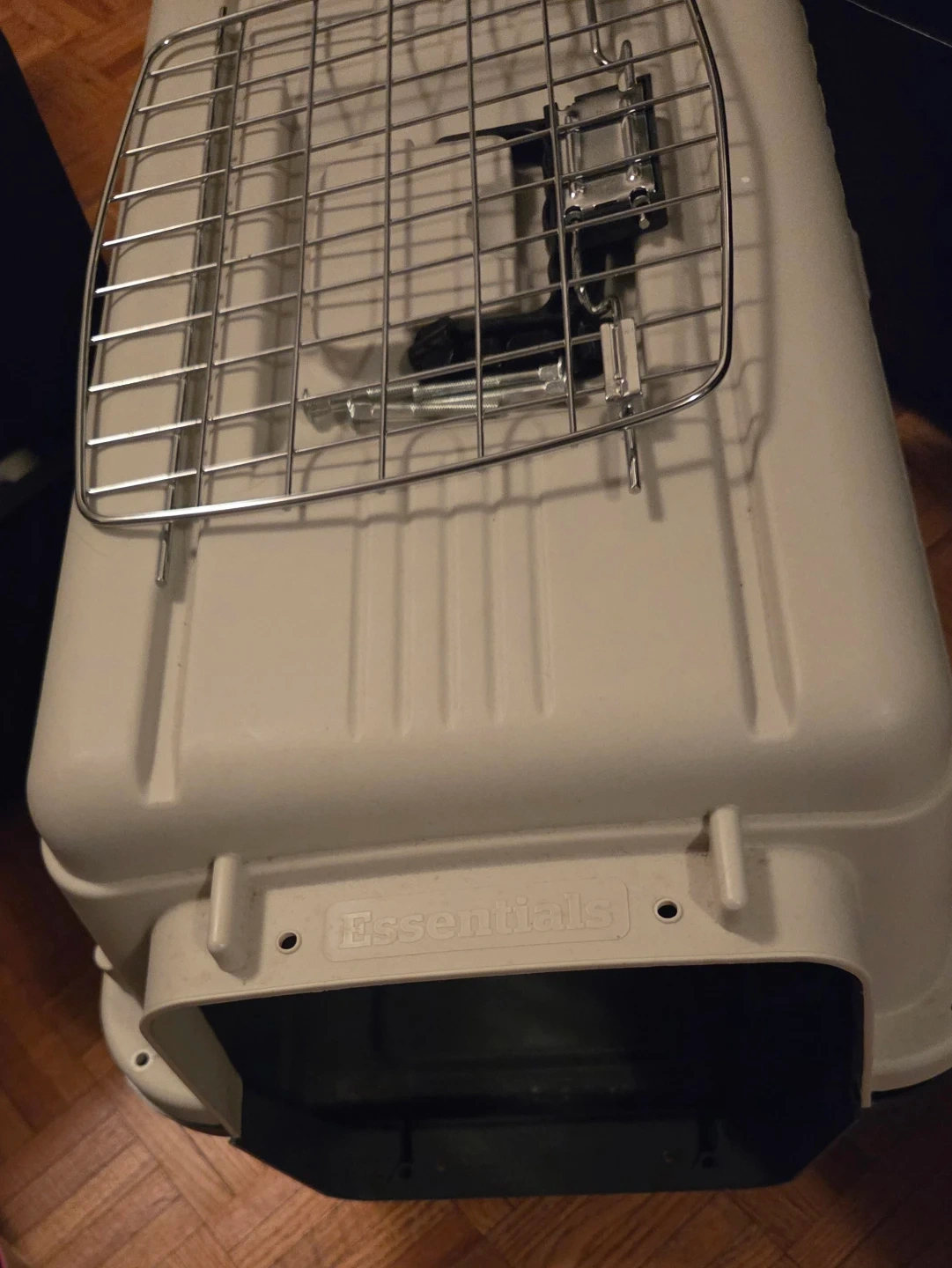 Selling a pet carrier crate. It's made of plastic. Includes metal hardware for assembly. Approx size measured 62x41x40