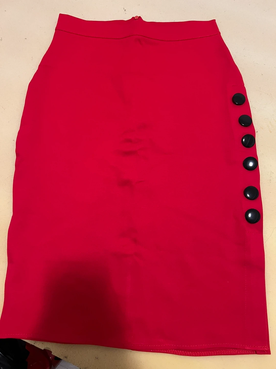Selling a vibrant red pencil skirt! It features stylish button detailing down the side. It's in great condition and ready for a new wardrobe
