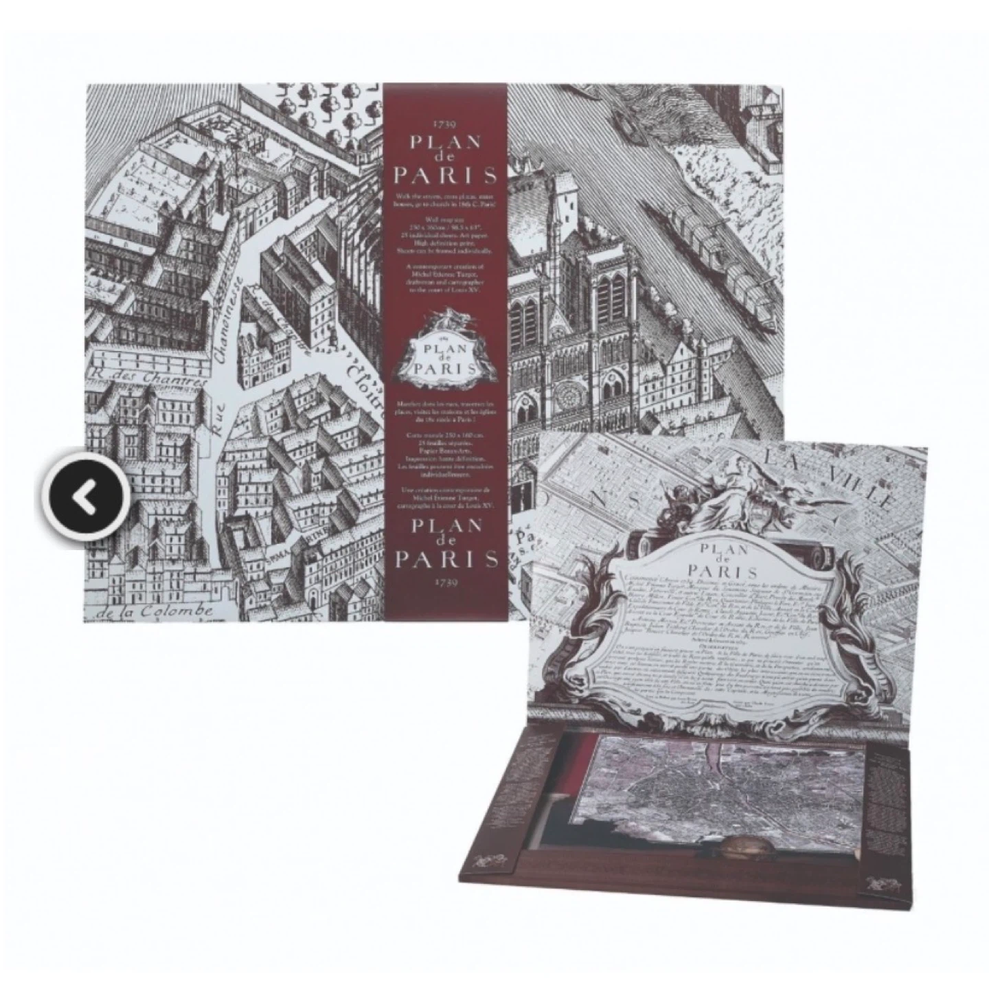 Beautiful reproduction portfolio of the 1739 “Plan de Paris” (Turgot Map) — a highly detailed historic map of Paris presented in multiple large-format sheets.