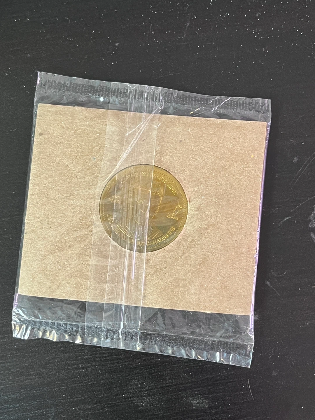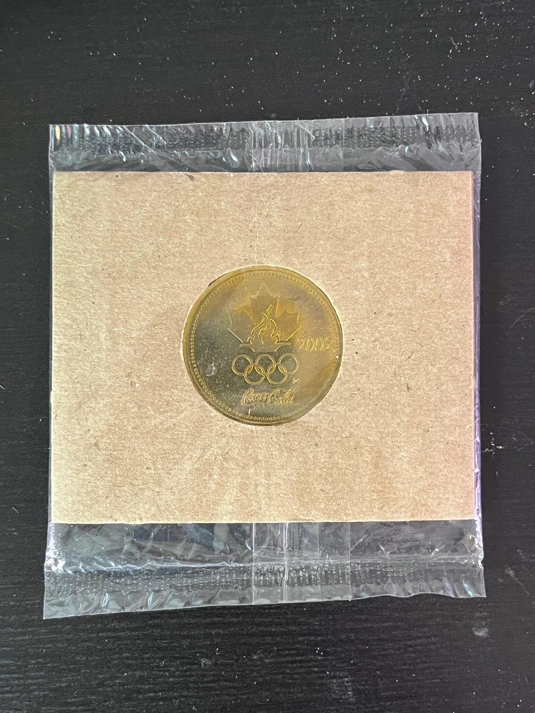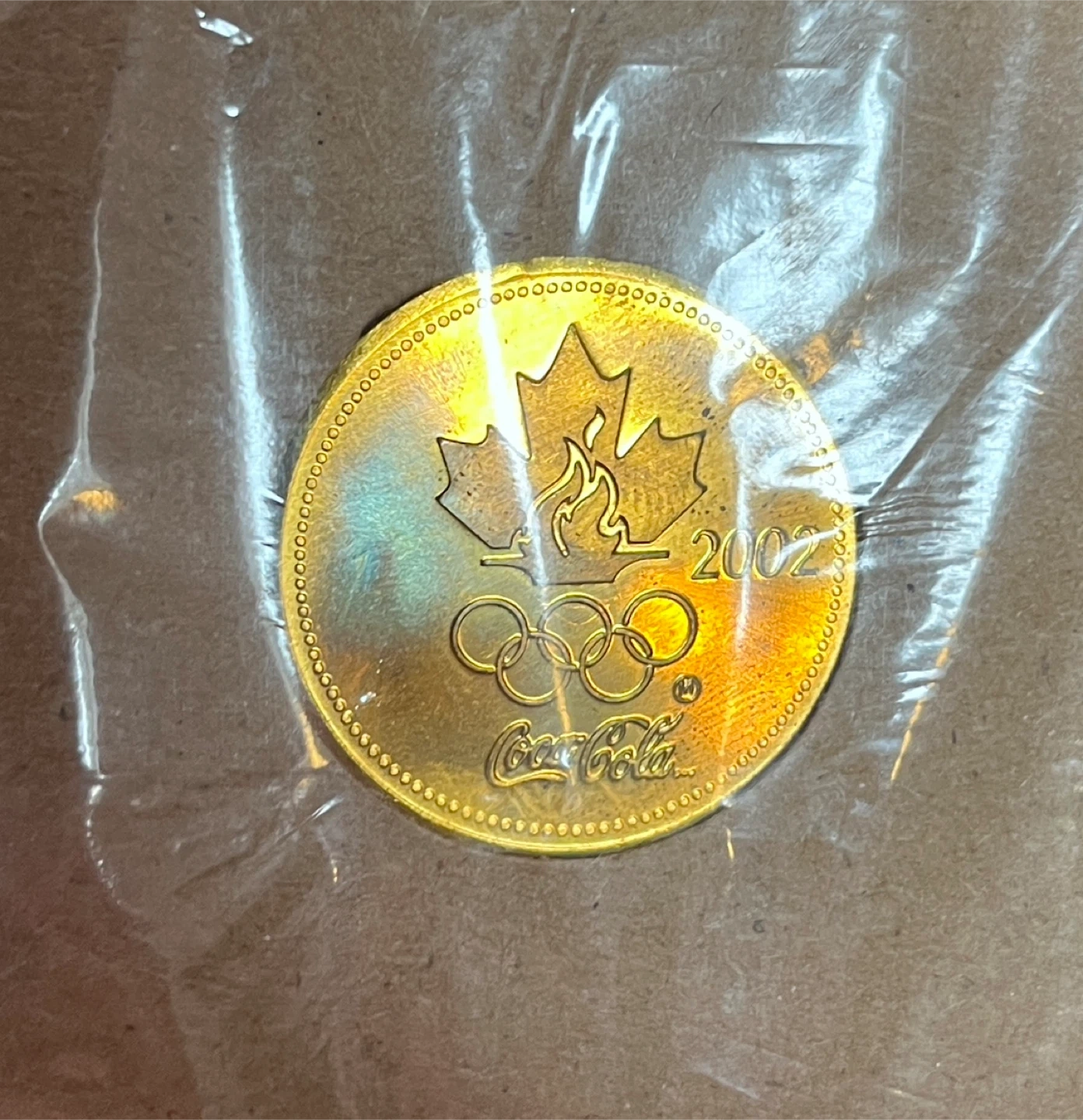 Coca-Cola 2002 commemorative coin featuring the Canadian Olympic Team and Rob Blake. It's gold-toned metal with Olympic rings and a maple leaf design. Still in its original packaging.